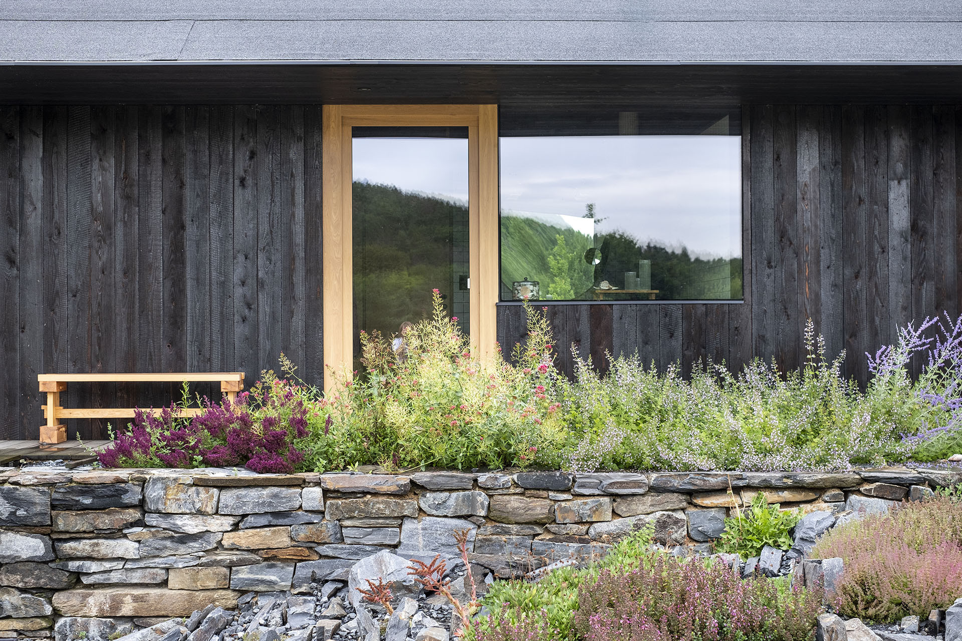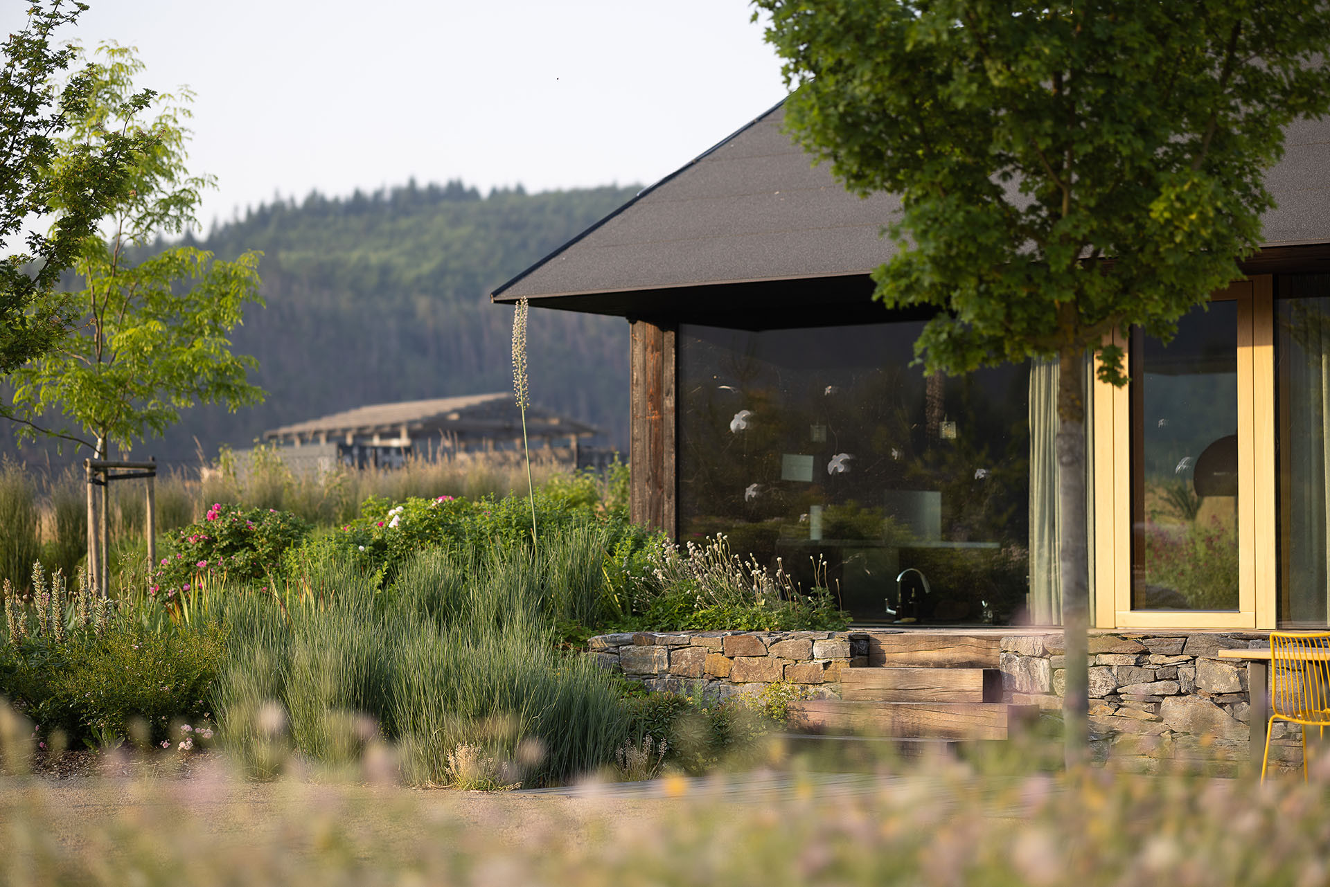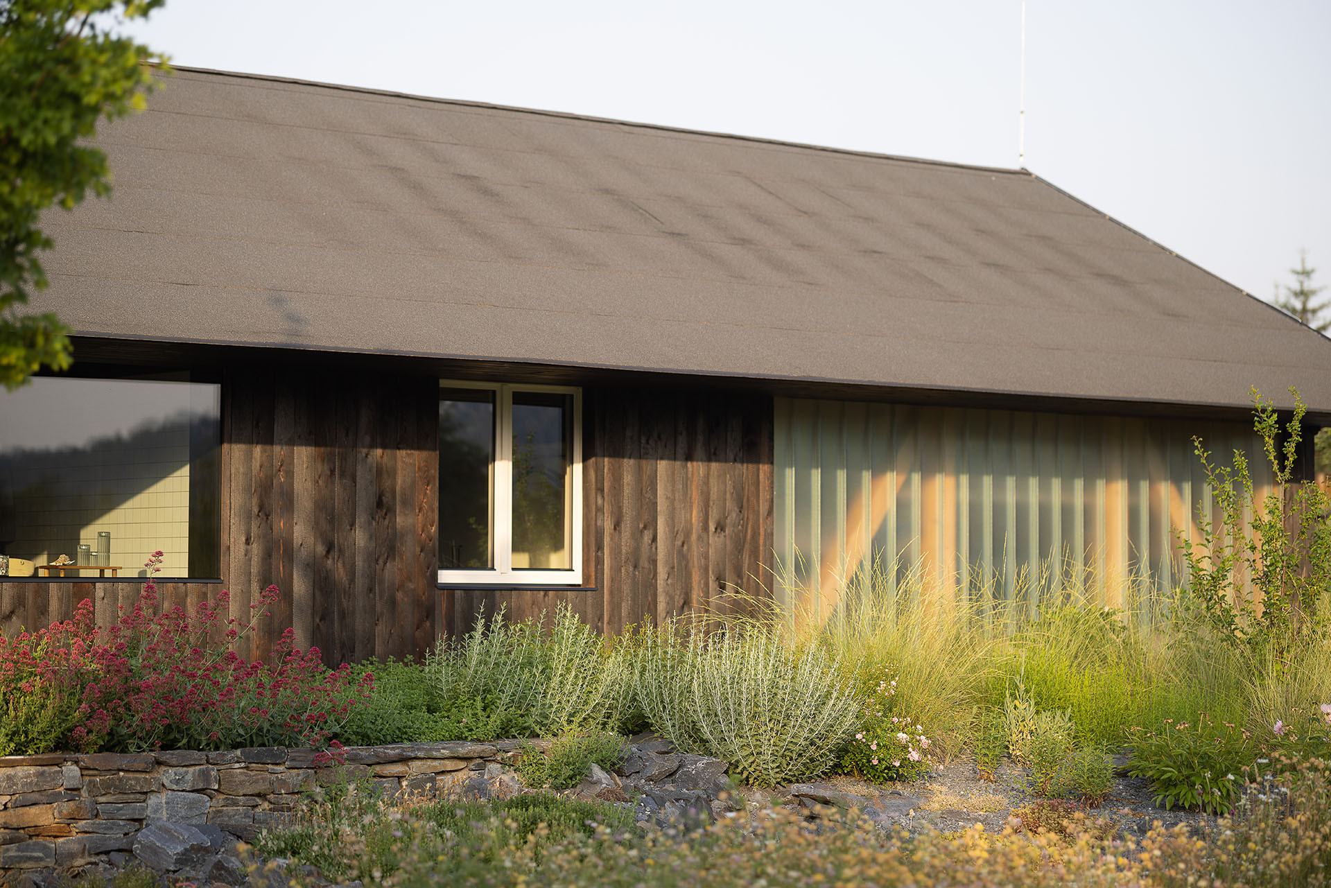 Zahrada domu při přehradě Kamýk měla co nejlépe splynout s okolní přírodní krajinou. Zahradní architekti z ateliéru Flera ji proto osázeli hlavně původními druhy rostlin. Zahradničit se ale dá na pozemku také, majitelé mají záhony doslova za okny domu.