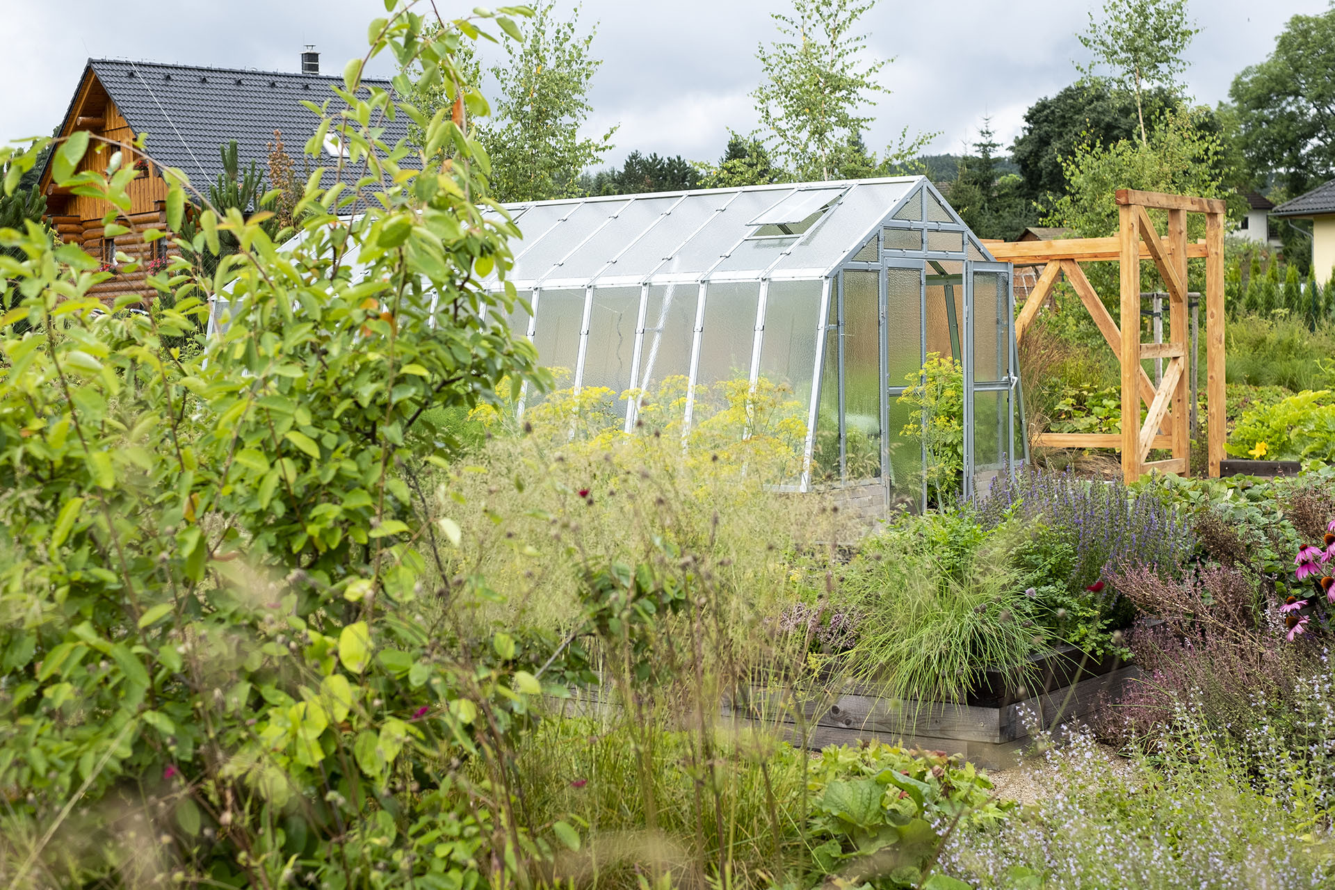 Zahrada jako louka, ve které je prostor pro záhony i skleník