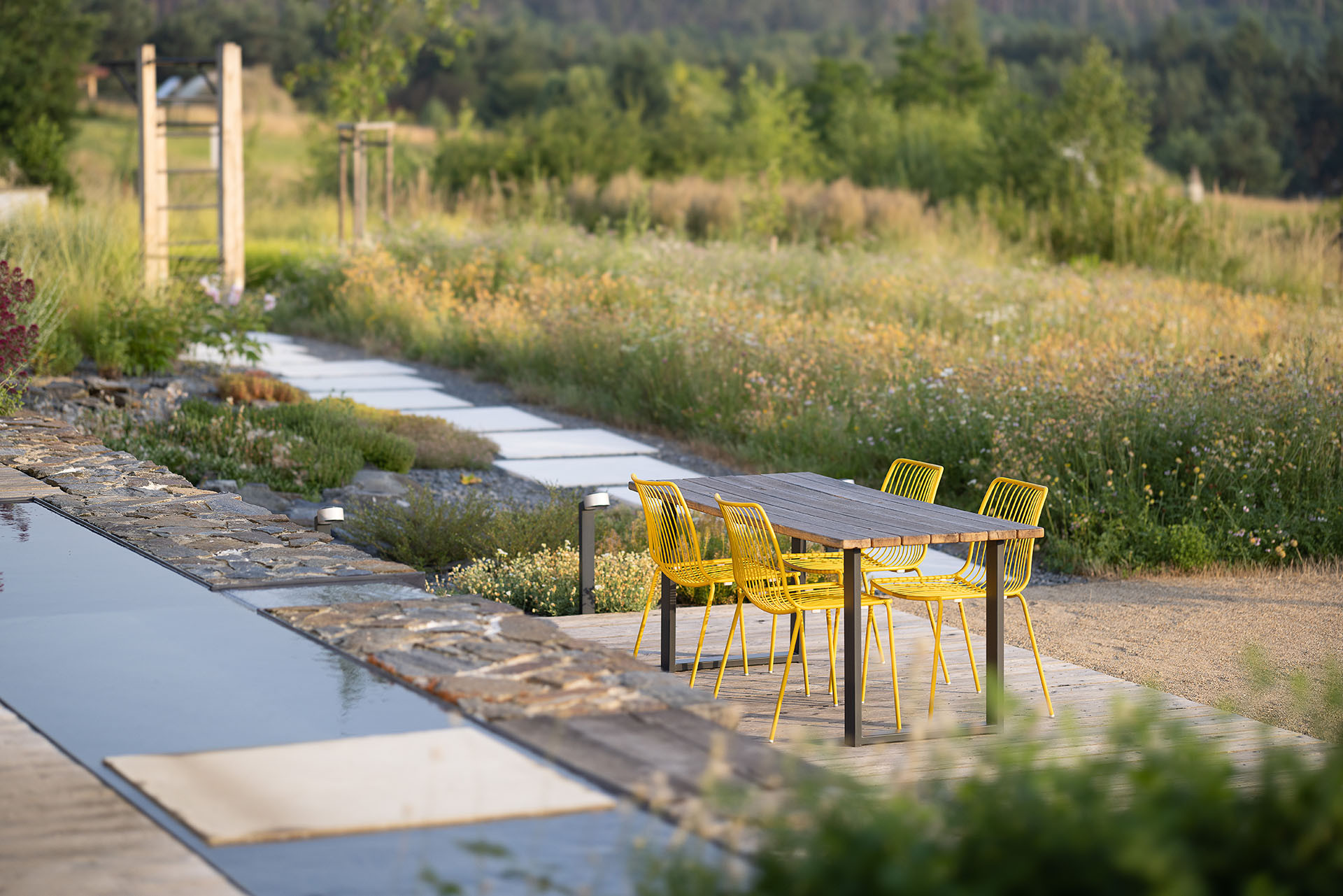 Na zahradě samozřejmě není jen louka, má taky řadu svých více komponovaných částí. „V zahradě ještě najdeme venkovní posilovnu, ohniště a kůlnu se sušákem na prádlo. Malá plocha udržovaného trávníku slouží majitelům pro chůzi bosou nohou,“ popisuje to architekt zahrady.