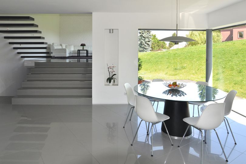V malé obci Pacov na Vysočině stojí na rozhraní nové a staré zástavby velmi atypický rodinný dům. Po hmotové stránce se jedná o dva výrazné objemy - vertikální a horizontální. První z nich navazuje na okolní zástavbu a slouží obytným prostorům, druhý pak funguje jako garáž, jejíž střecha ovšem rozšiřuje plochu zahrady a dodává jí umělý svah.