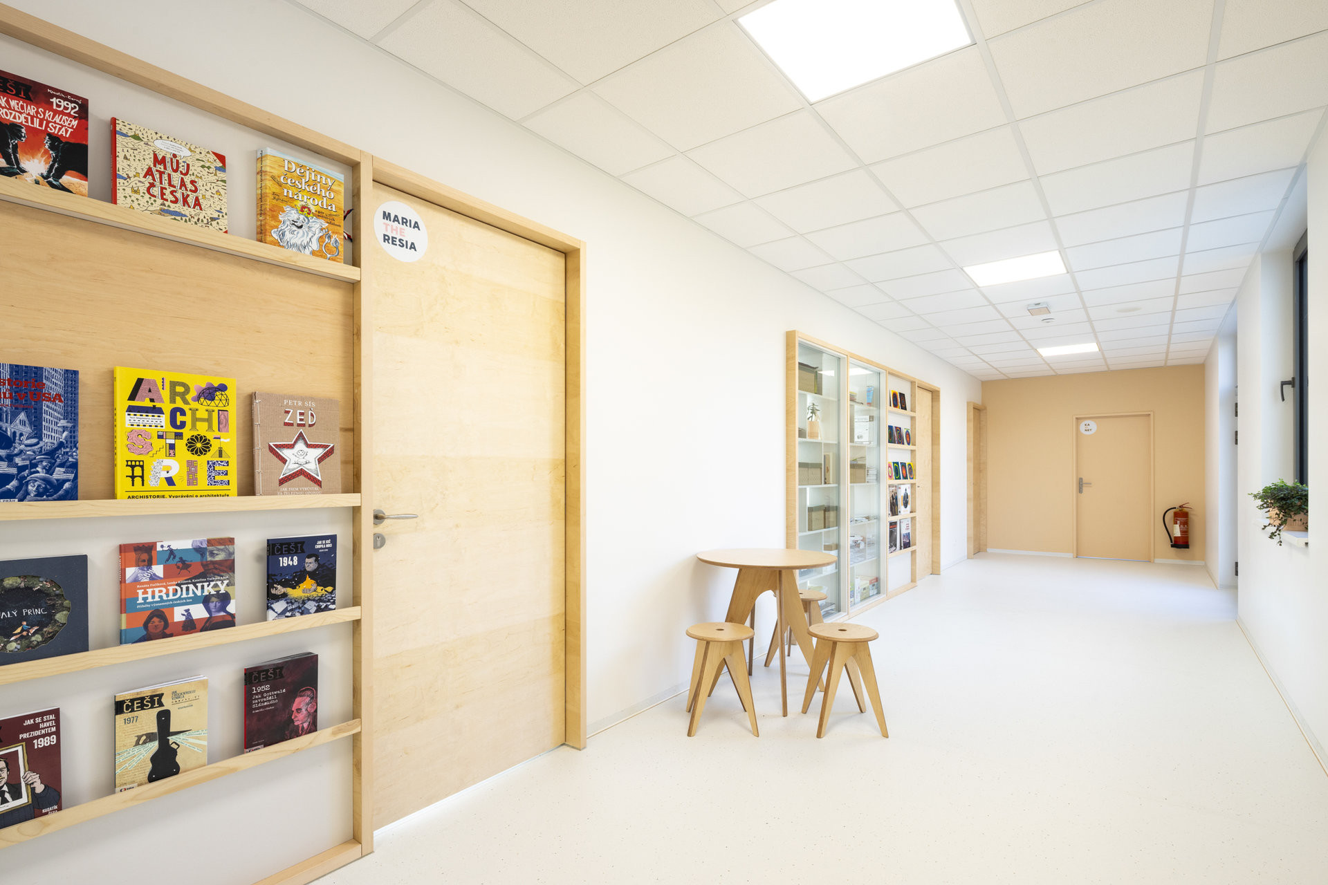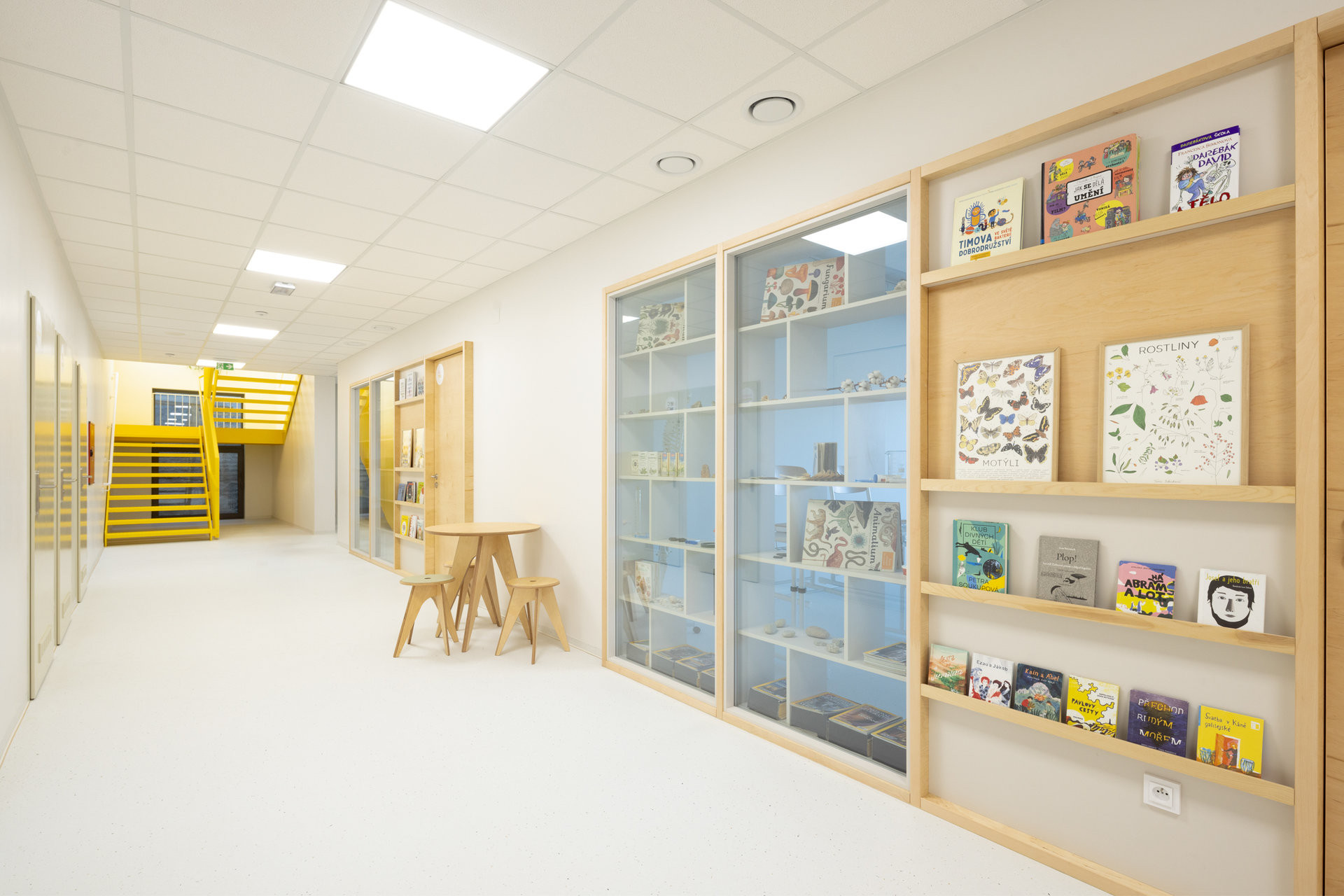 Designér Michal Babic vsadil na pravdivost materiálů a práci s autenticitou. Dominantou interiéru je schodiště inspirované bývalým pavilonem EXPO, ve kterém nyní sídlí dodavatel modulární školy, společnost KOMA MODULAR, kterou designér Michal Babic během realizace navštívil. Prosklené stěny mezi třídami prostor ještě více otevírají a sousední knihovna mu dodává útulnost.