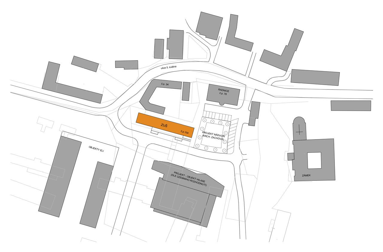 Návrh řeší přestavbu stávajícího objektu č. p. 104 v Dolních Břežanech pro potřeby obce pro veřejné využití. Stavebním programem je základní umělecká škola doplněná víceúčelovým společenským sálem.