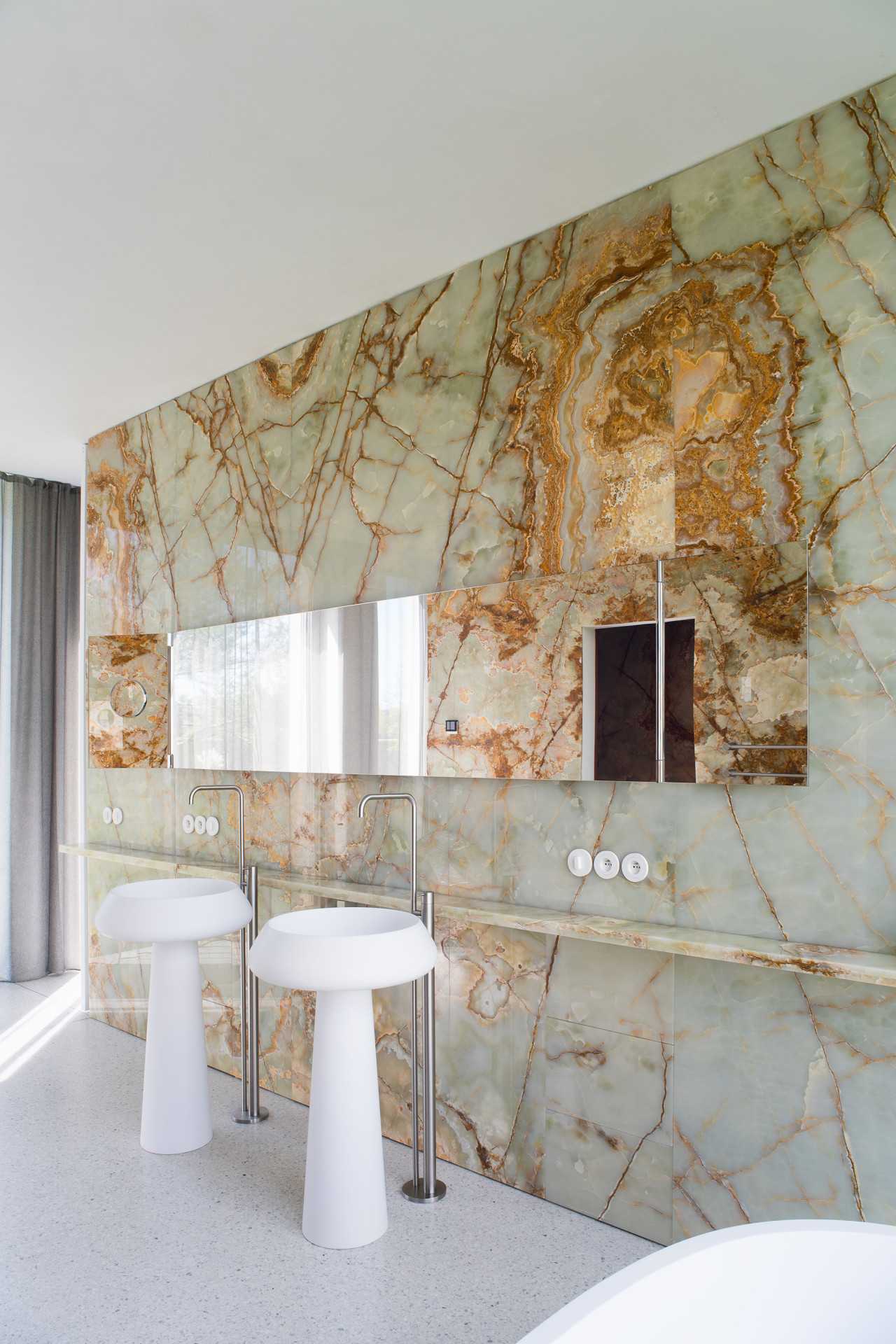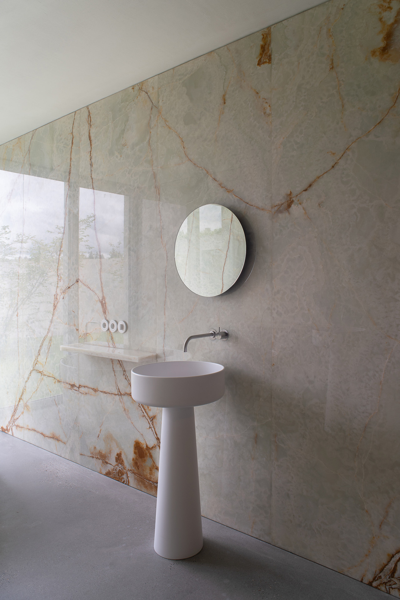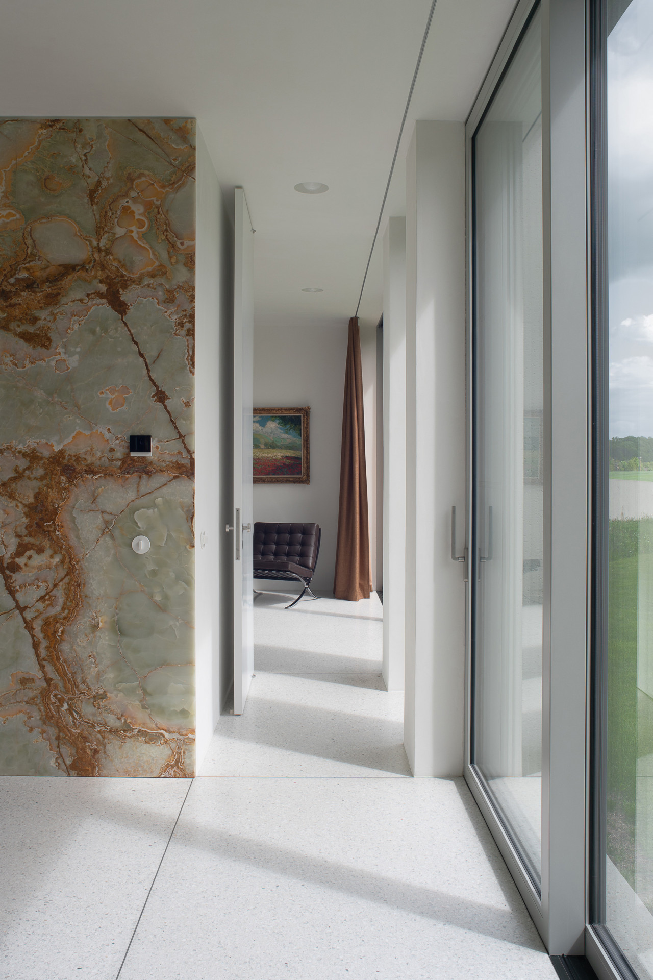 I uvnitř vila těží z koncepce rozvětvených částí: „Pokoje v každém křídle jsou propojeny jedinou chodbou, která poskytuje průhled celým souborem místností,“ vysvětlují architekti. Chodbu však lze také předělit otočnými panely. Materiály jsou střídmé, ale ušlechtilé: pískovaný beton působí jako kámen, litý beton a teraco na podlahách, dýha, v koupelnách onyx. Dohromady neustále se měnící hra světla, barev a obrazů. I důrazem na krásu vnitřního prostoru připomíná tahle vila šlechtické sídlo.