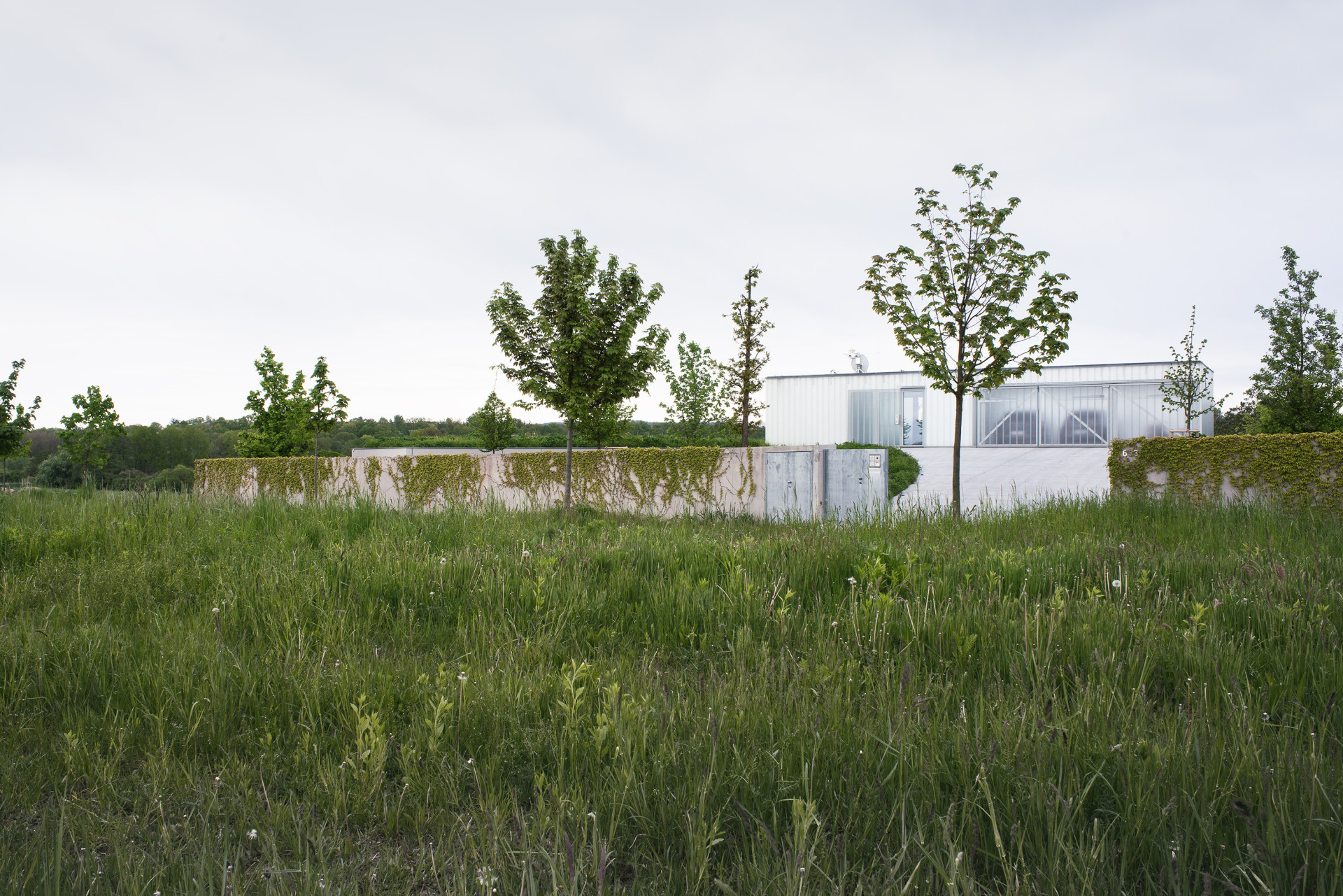 Aby se plocha zahrady zvětšila, je garáž umístěná na střeše domu. Zemina vytěžená při stavbě se využila jako příjezdová cesta, zemní val dům také ze severu stíní a udržuje stabilní teplotu.