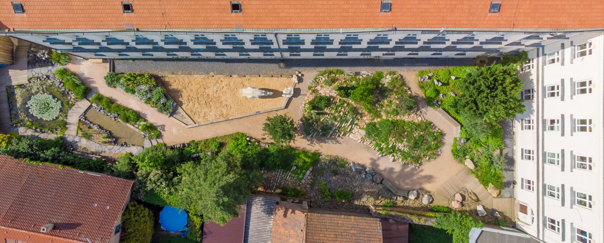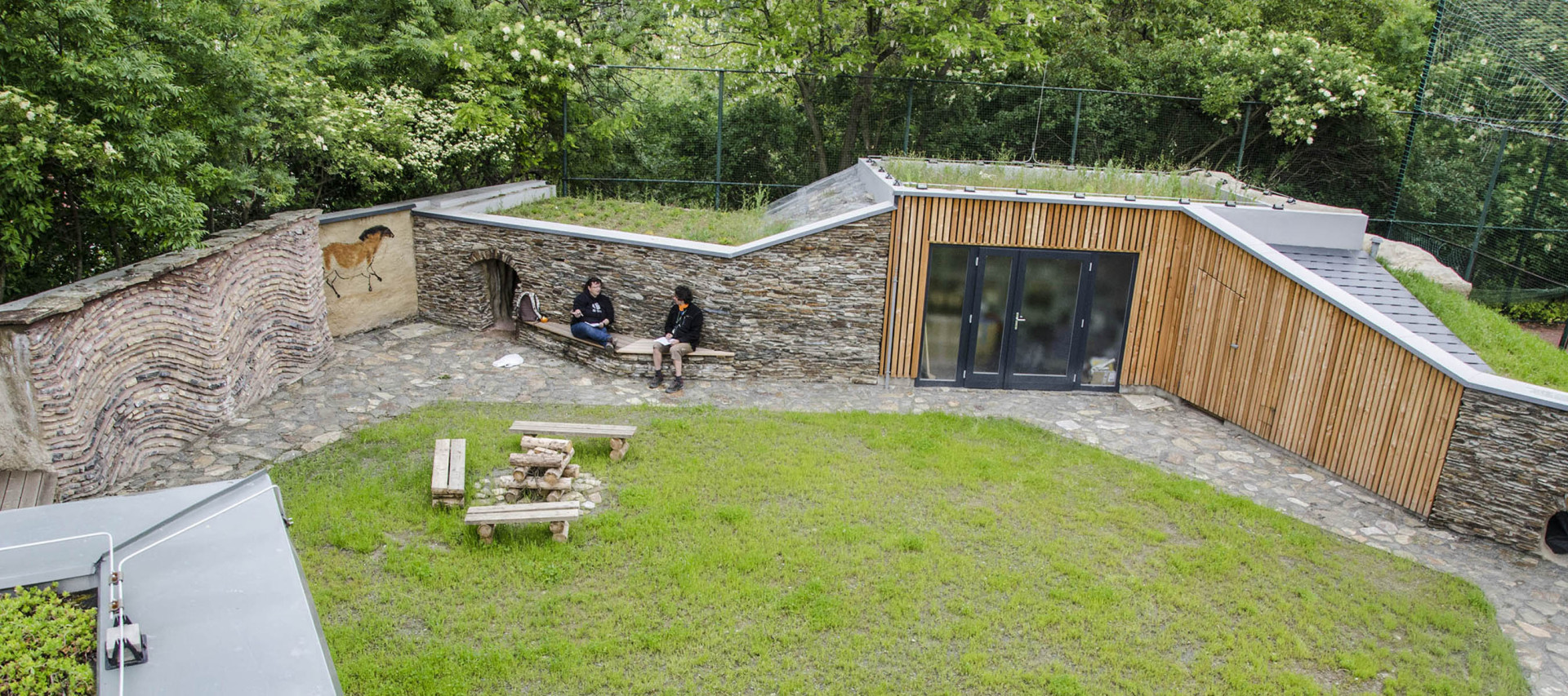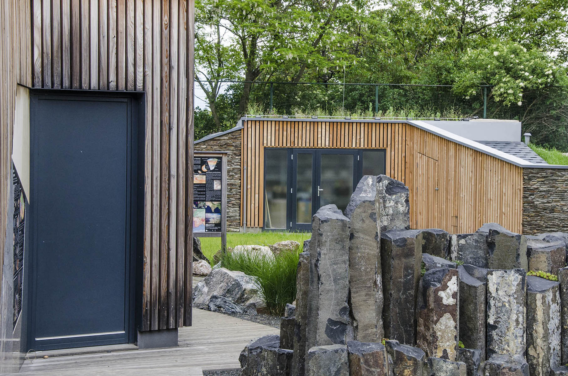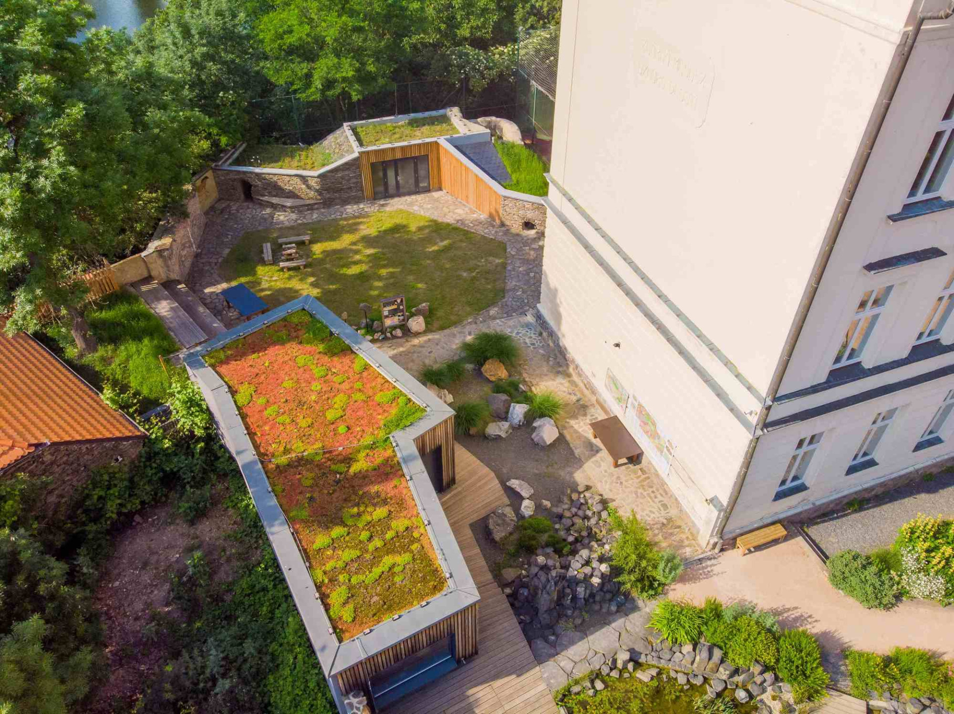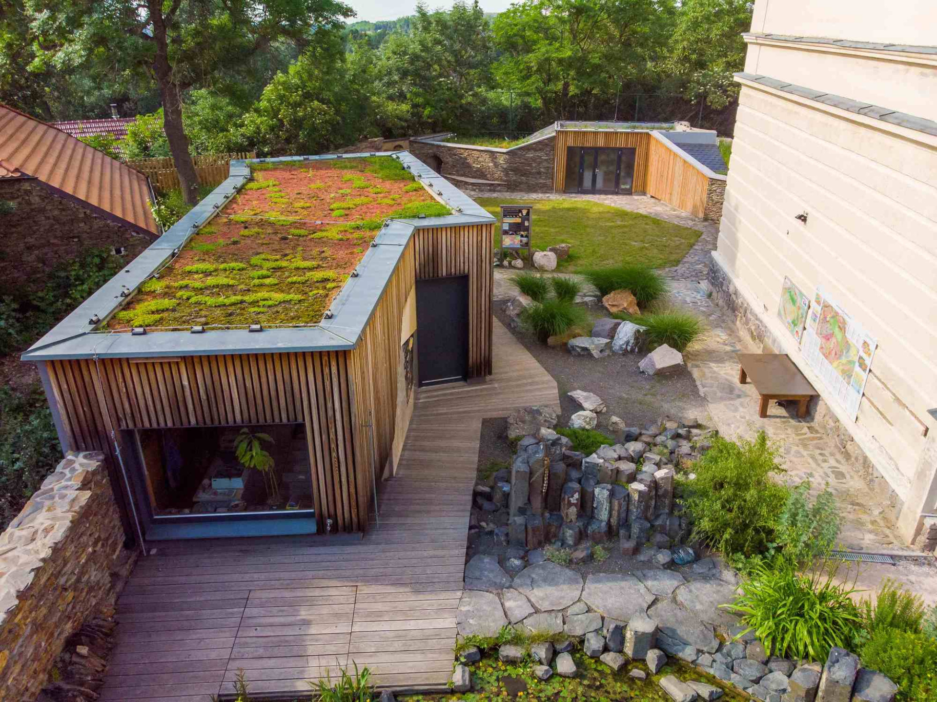 V zahradě najdeme soustavu biotopů s horninovým podložím, ve kterých se velmi dobře daří rostlinám i živočichům. Prostor dále dotváří vápencový ochoz, čedičové varhany a dětmi oblíbená jezírka s možností rýžování minerálů a simulace povodní. Jako zázemí slouží geologická laboratoř a depozitář vzorků, jejichž fasády tvoří výukové kamenné bloky v kombinaci s odolným modřínovým dřevem. Zelené střechy objektů zadržují vodu a pomáhají tak vytvářet lokálně příznivé klima.