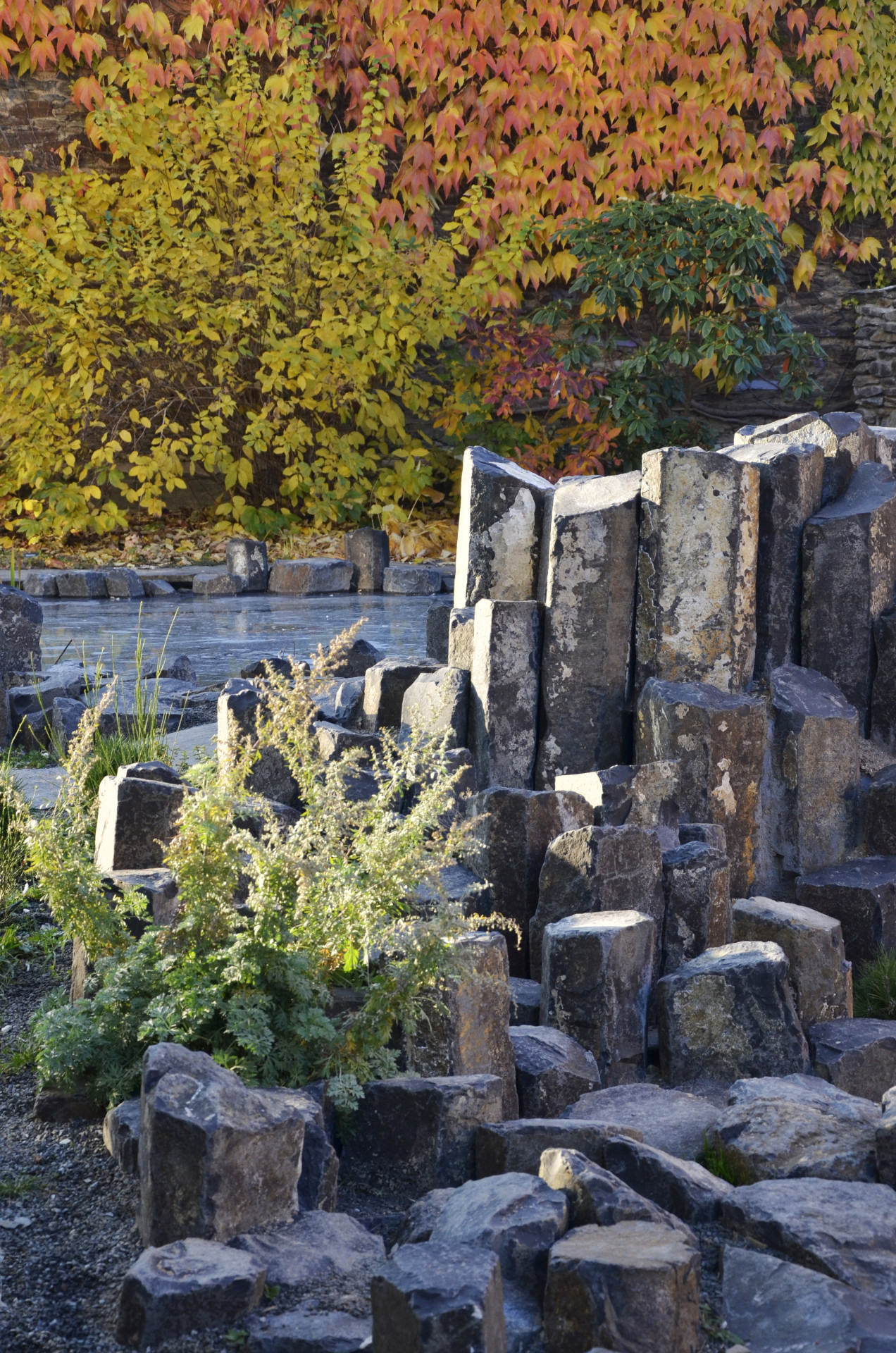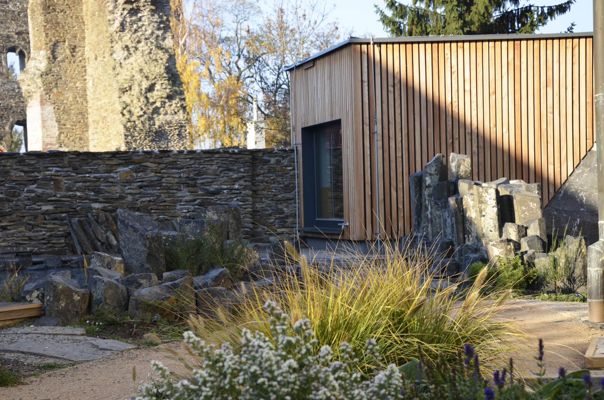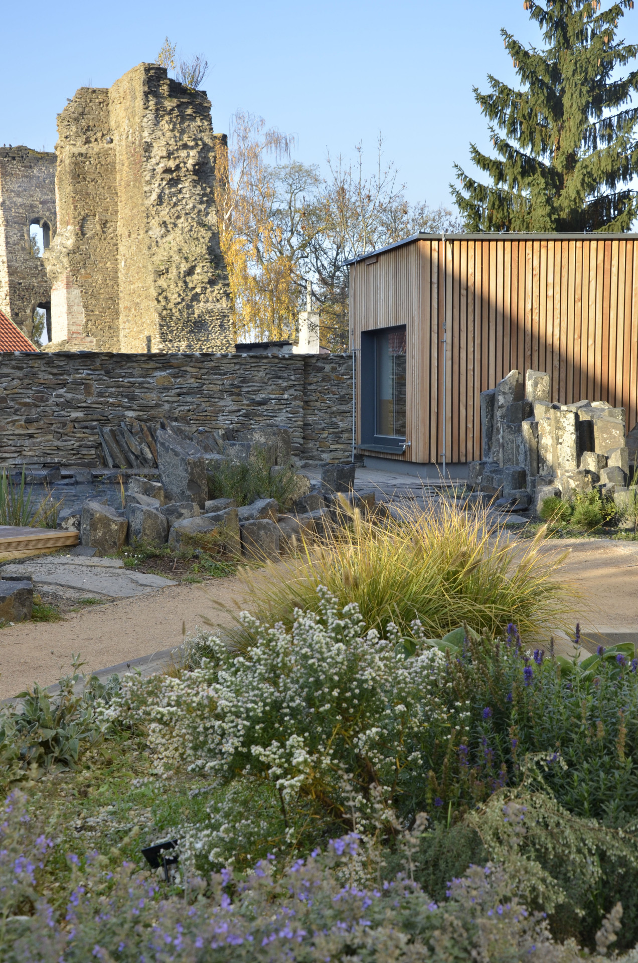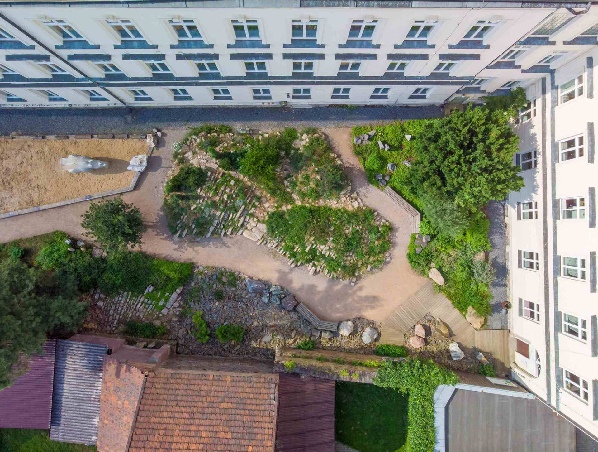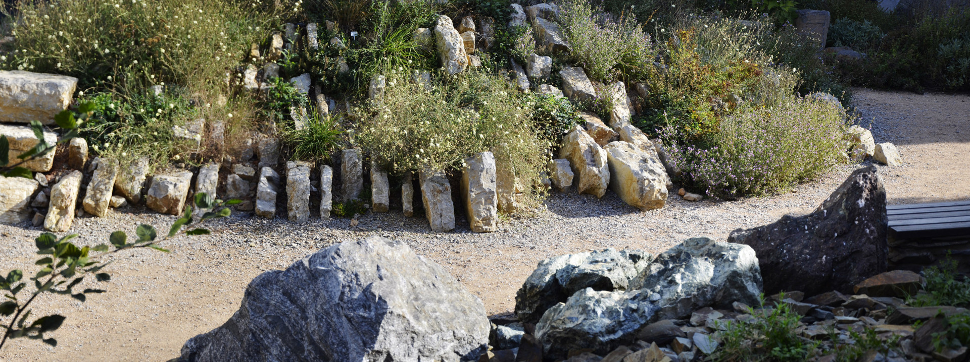 V zahradě najdeme soustavu biotopů s horninovým podložím, ve kterých se velmi dobře daří rostlinám i živočichům. Prostor dále dotváří vápencový ochoz, čedičové varhany a dětmi oblíbená jezírka s možností rýžování minerálů a simulace povodní. Jako zázemí slouží geologická laboratoř a depozitář vzorků, jejichž fasády tvoří výukové kamenné bloky v kombinaci s odolným modřínovým dřevem. Zelené střechy objektů zadržují vodu a pomáhají tak vytvářet lokálně příznivé klima.