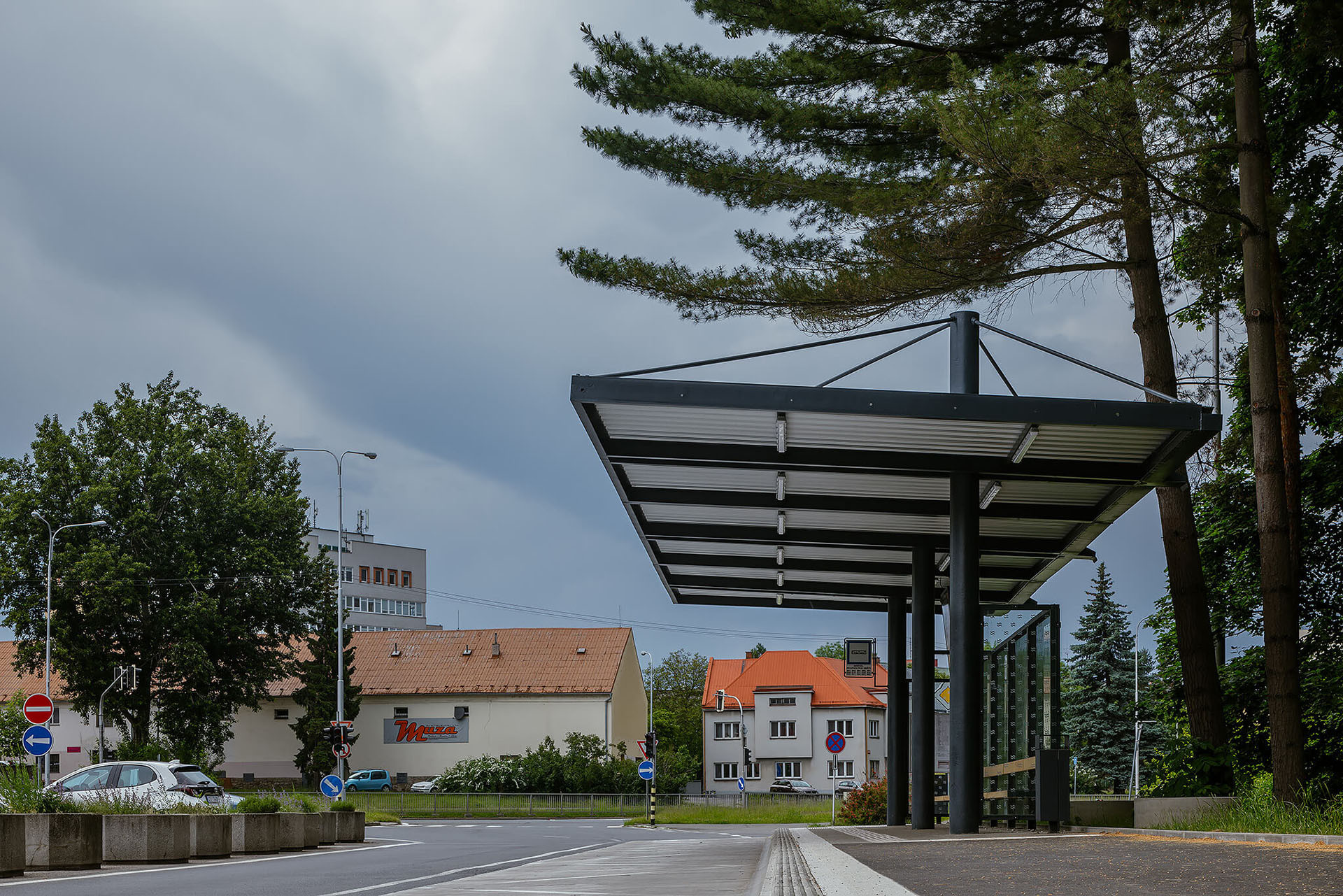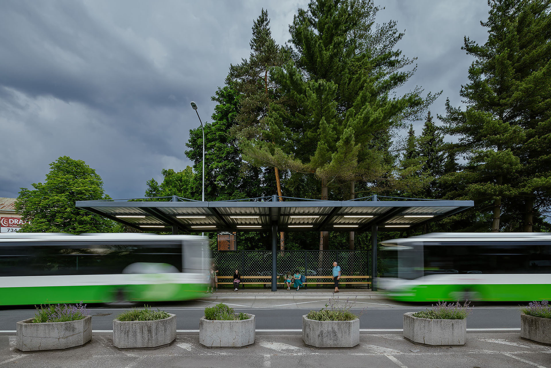 Mezi parkem a zastávkou byla dřevěná zástěna, kterou nahradilo sklo. Zůstaly ocelové sloupy, přibyly nové lavice z dubových hranolů. „Při návrhu jsme kladli důraz na to, aby čekání na autobus bylo příjemnější s výhledem do přilehlých Smetanových sadů a aby bylo dodrženo přiměřené závětří,“ popisují architekti.