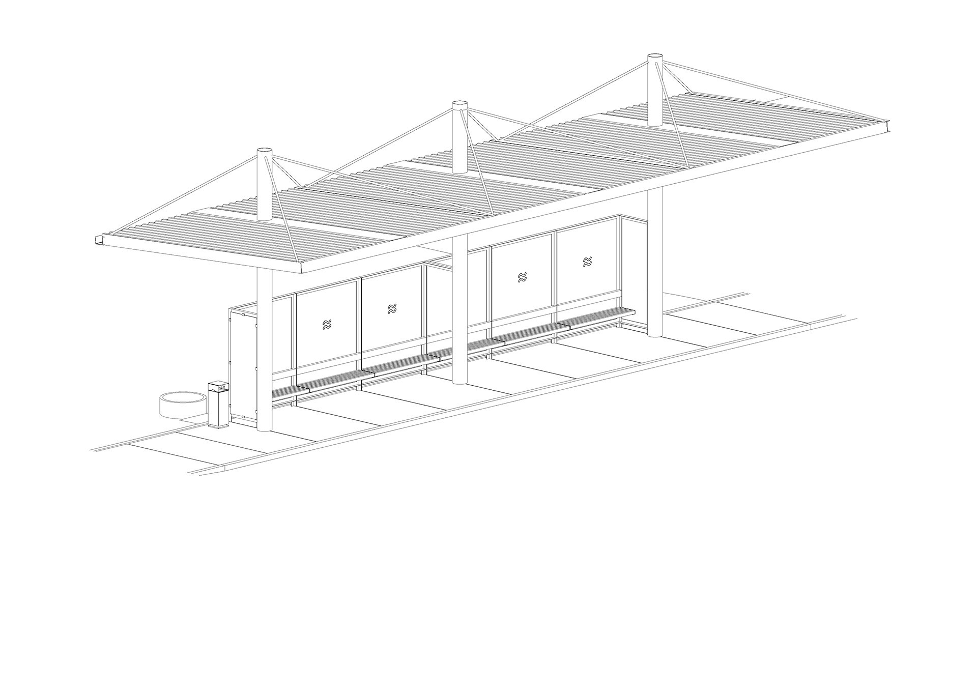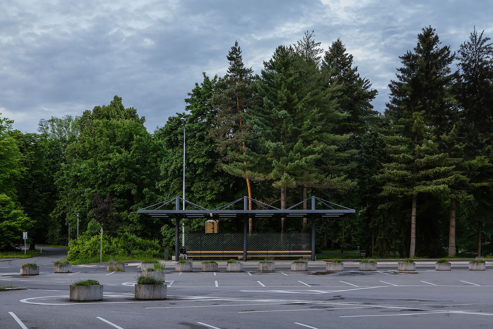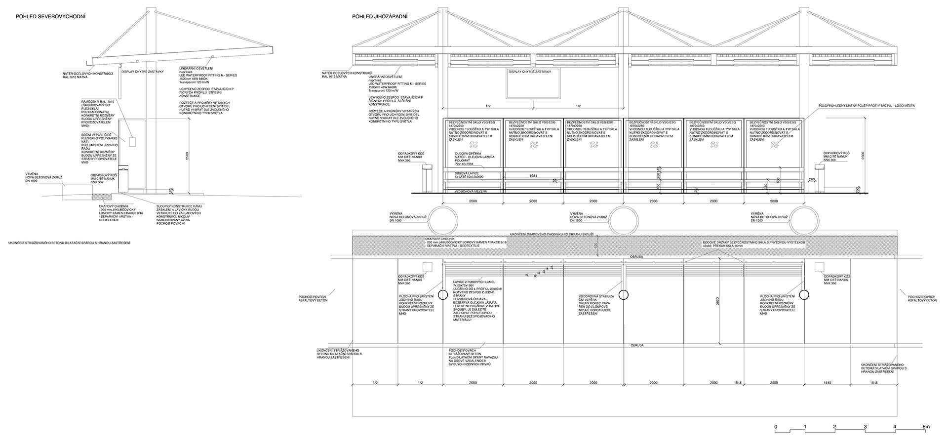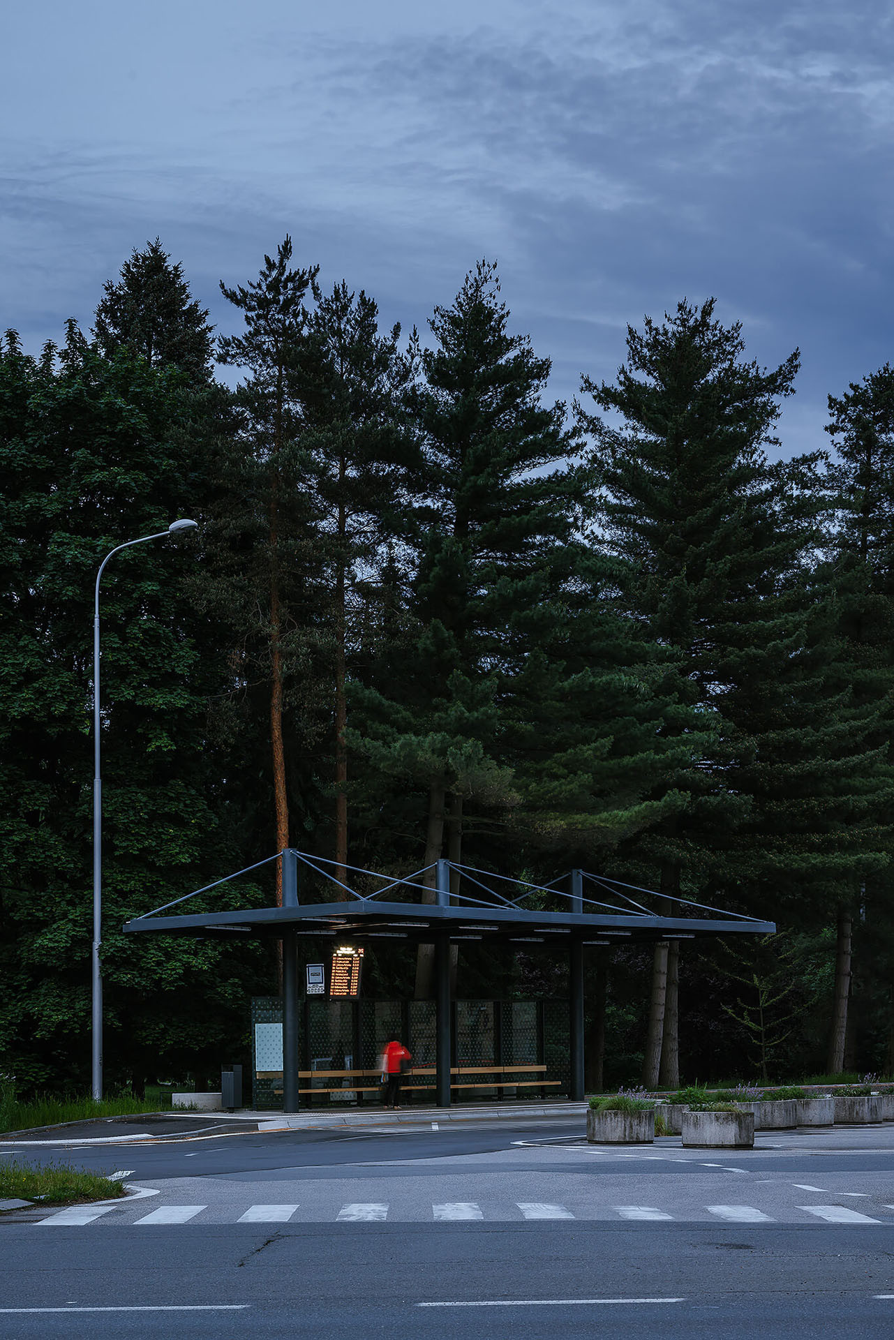 Všechny prvky – od konstrukce objektu po zařizovací předměty jako jsou odpadkové koše nebo rám pro digitální informační panel – ladí společnou antracitovou barvou. Novou střešní krytinu tvoří světle šedý trapézový aluzinkový plech, který ve večerních hodinách odráží osvětlení. Byly vyměněny vsakovací skruže v zadní části, které odvádějí dešťovou vodu z chrličů a časem budou porostlé popínavými rostlinami.