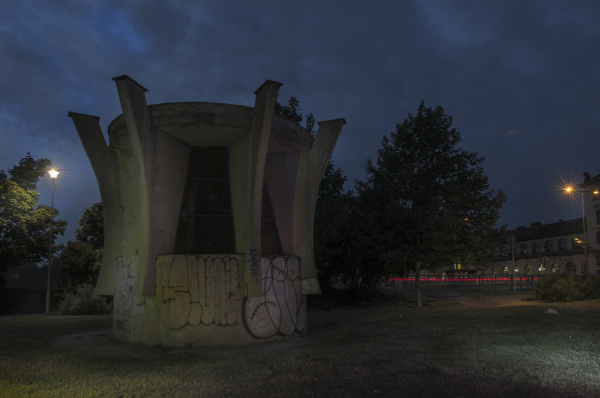 První z nich dělí od Fantovy staré budovy nádraží magistrála a jako hlavní architekt stavby je na výkresech podepsán přímo spoluautor nového Hlavního nádraží architekt Danda. Betonový kruhový základní blok na sobě nese k vrcholu samotný zužující se osmiúhelníkový pyramidovitý výdech z děrovaného plechu, který do stran roztínají ladné linky prohnutého betonového žebroví.
