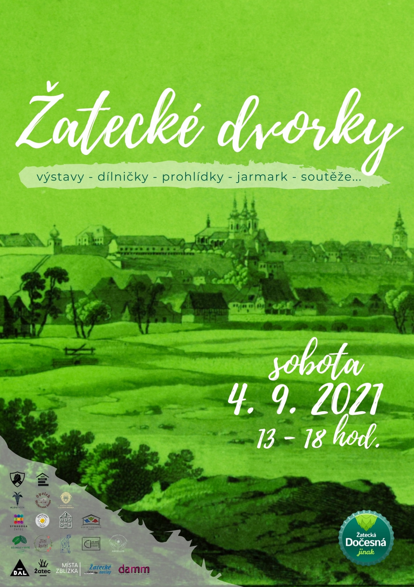 Čtvrtý ročník Žateckých dvorků se odehraje v Žatci v sobotu 4.9.2021. Na tento den připadá i nejvíce akcí z městem podpořeného projektu Žatecká Dočesná jinak. Spolek A dál?, který Žatecké dvorky letos připravil, spojil síly se všemi pořadateli a provede Vás nejen deseti dvorečky a zákoutími, ale i všemi kulturními akcemi, které se v tento den ve městě chmele uskuteční.