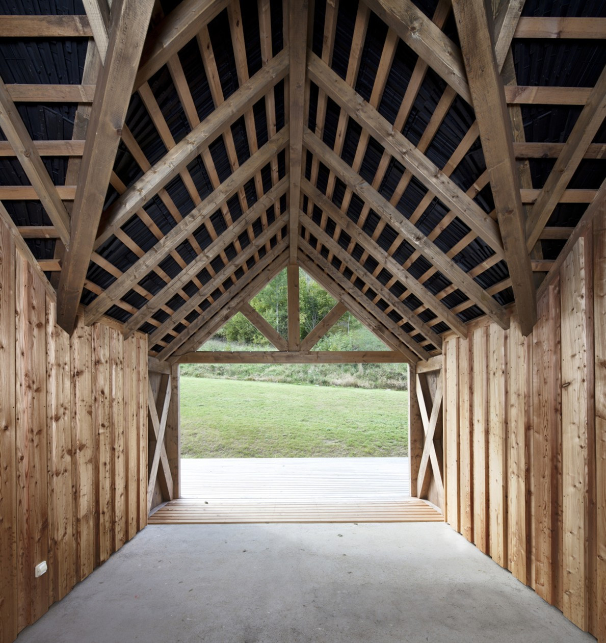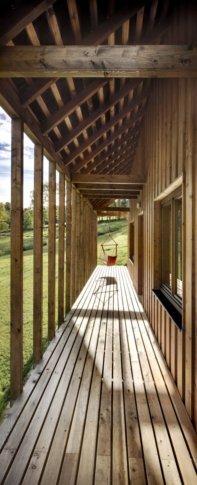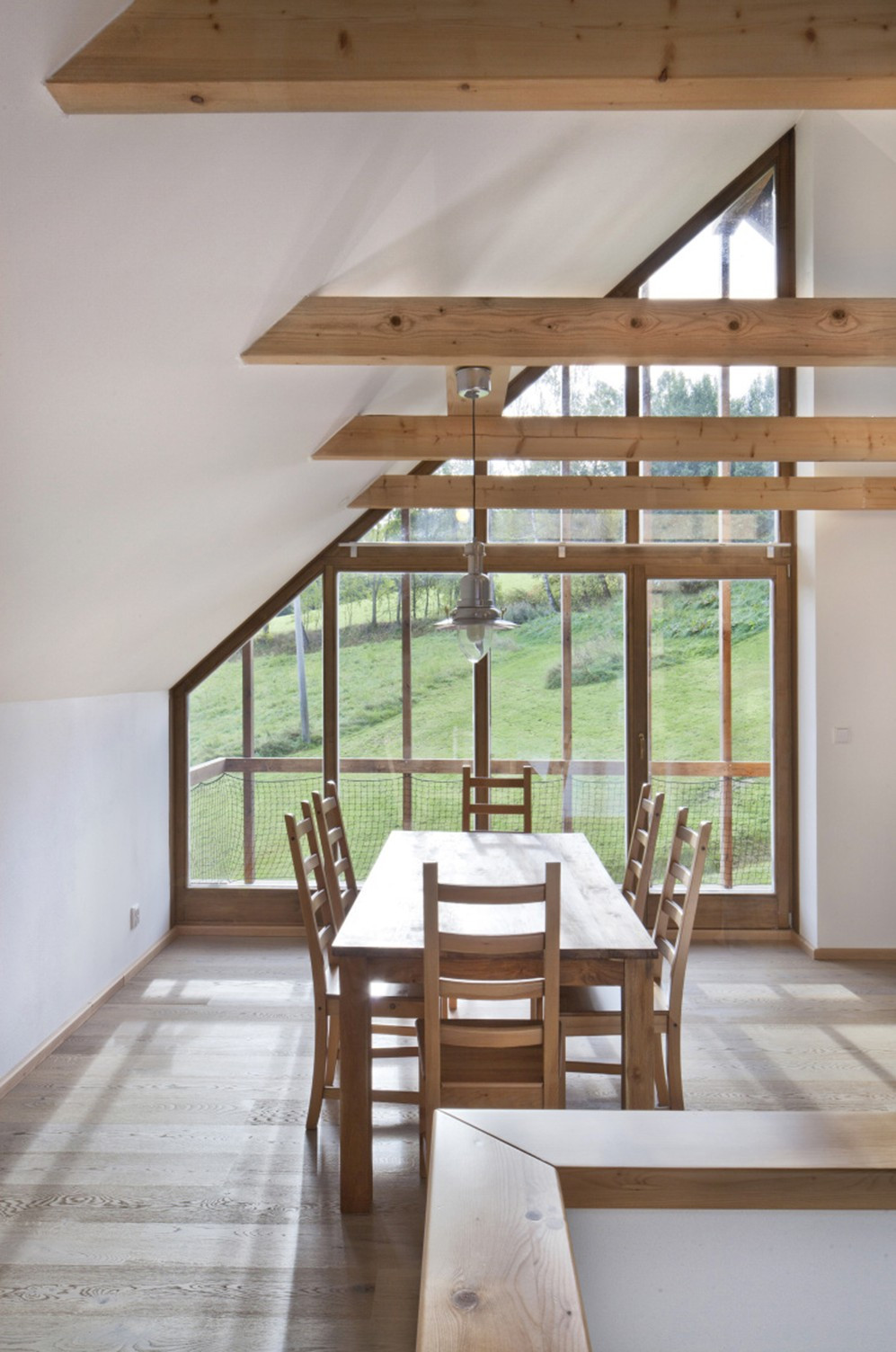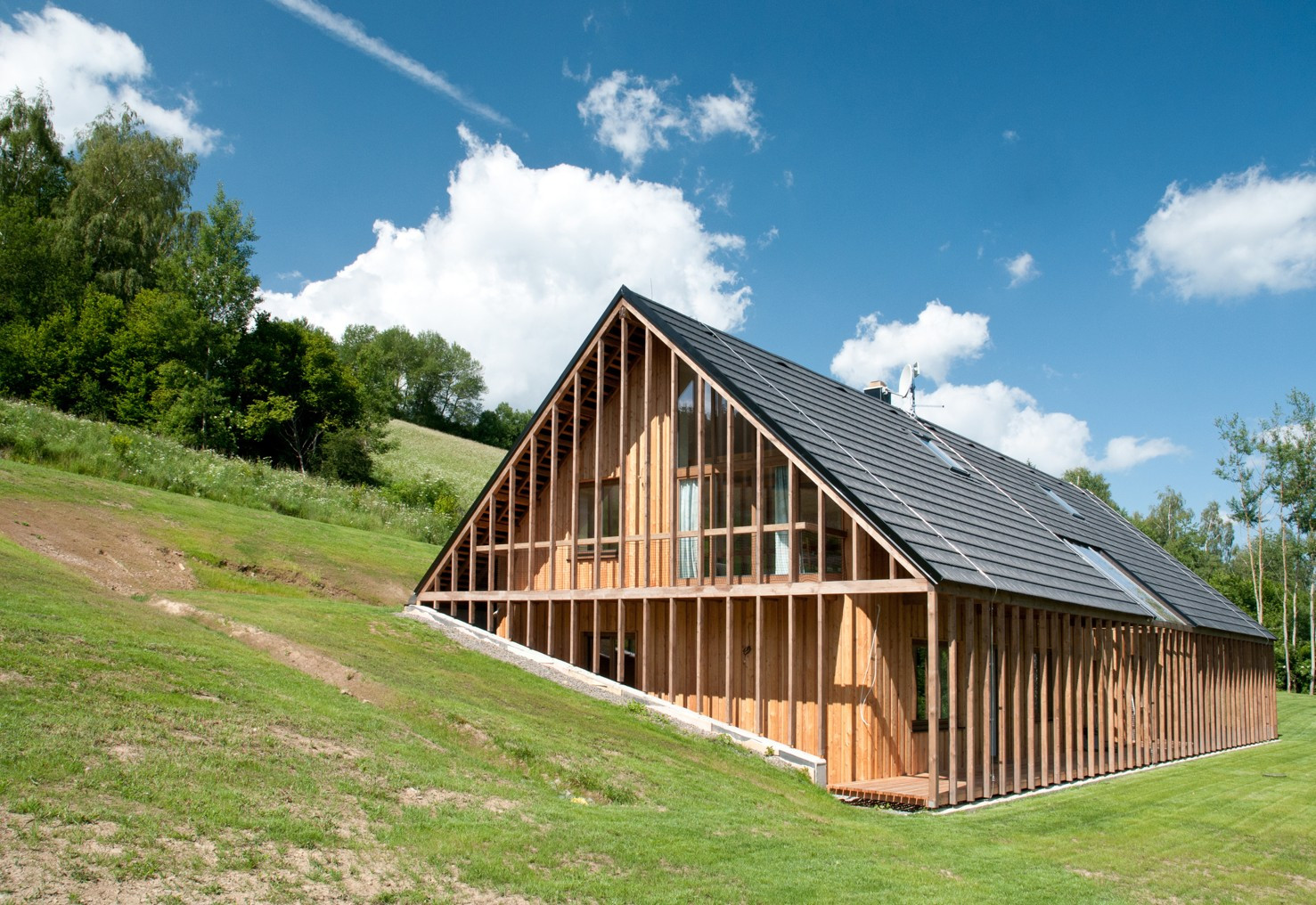Studio A.LT Architekti umístilo do svahu v šumavském pohraničí dva totožné domy sloužící rodinnému bydlení a pronájmu k rekreačním účelům. Strmé klesání pozemku využili architekti ve svůj prospěch a navrhli objektům samostatné přístupy z obou podlaží vedoucí přímo na terén. Ze stran nepřiléhajících ke svahu obklopuje domy velkorysé podloubí s rastrem z modřínových trámků, které vytváří jemný přechod mezi interiérem a exteriérem. Návrh podléhal schválení CHKO Šumava, vzhledem k tradičnímu pojetí staveb však nenastal žádný problém.