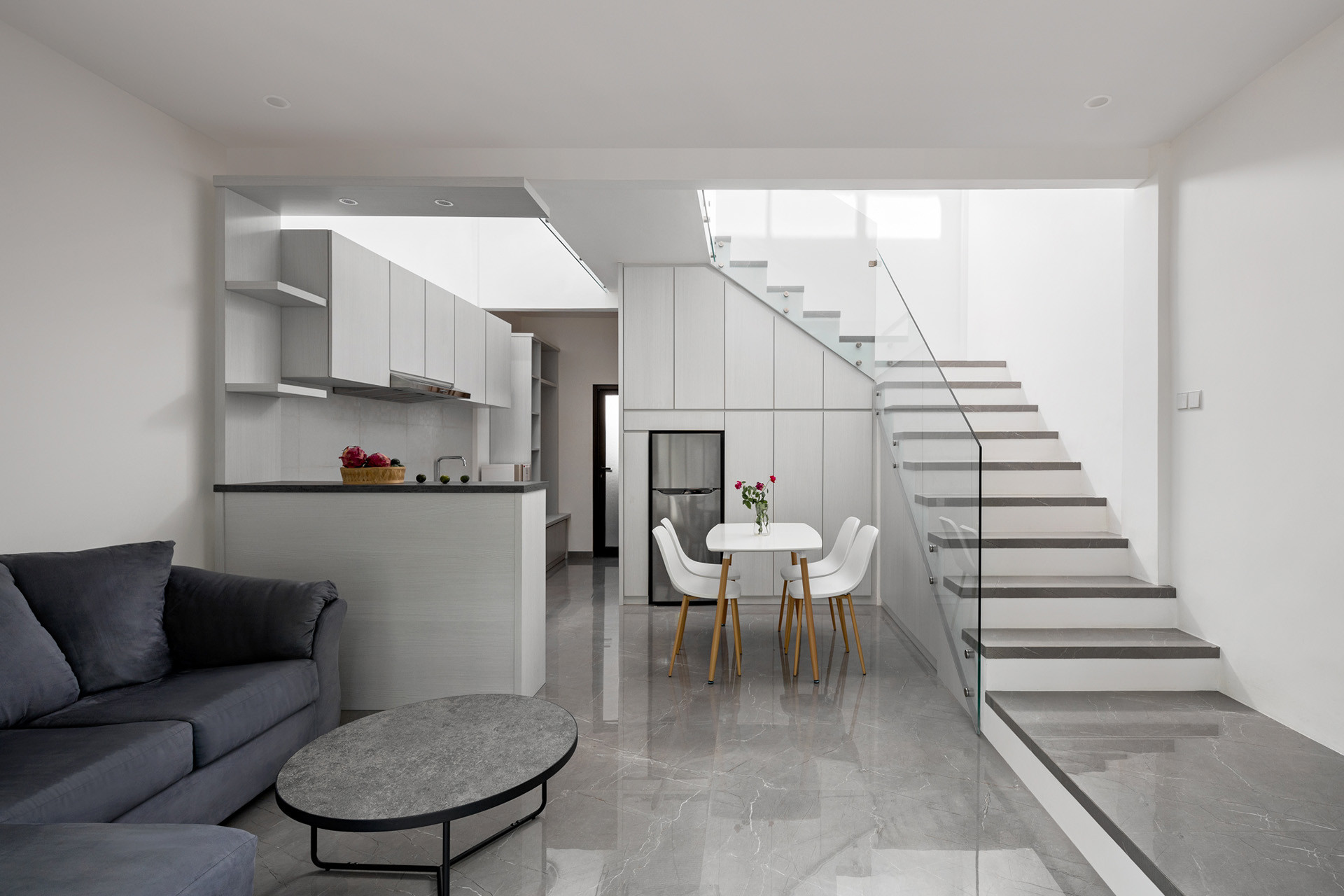 Podle tohoto vzoru se začaly posléze stavět všechny domy naráz. Dělníci byli velmi rychlí a přizpůsobiví a ocenil jsem jejich zručnost. Některé detaily, které se běžně na stavbách dělají, mě mile překvapily. Jako například tzv. kamenický spoj. Jedná se o spoj dvou keramických obkladů, které jsou seříznuté pod úhlem 45°. Když se k sobě přiloží, nepoznáte že se jedná o dvě keramické desky. Dalším detailem je podlahová podomítková lišta, která je zapuštěná ve stěně a je v líci s omítkou. Výhodou takového řešení je, že vám nesedá prach na horní hranu lišty. Ne že by se oba tyto detaily v Česku neprováděly, ale umí je málokdo. Většinou jsou velmi drahé a stavebním firmám se do nich nechce. Když se o ně architekt v návrhu pokusí, je to hned první položka, kterou developer zavrhne.