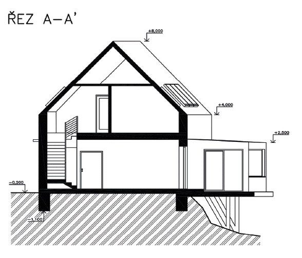 Terasa vybíhající ze svahu je založena na betonových pilotech a spolu s přidanou hmotou pracovny je řešena kontrastně proti objektu se sedlovou střechou.