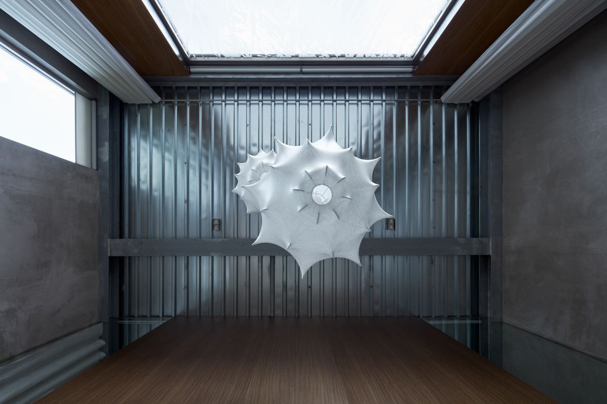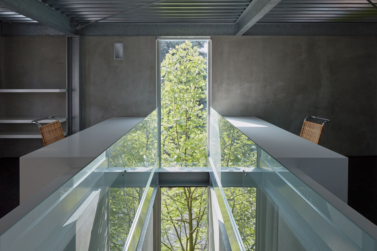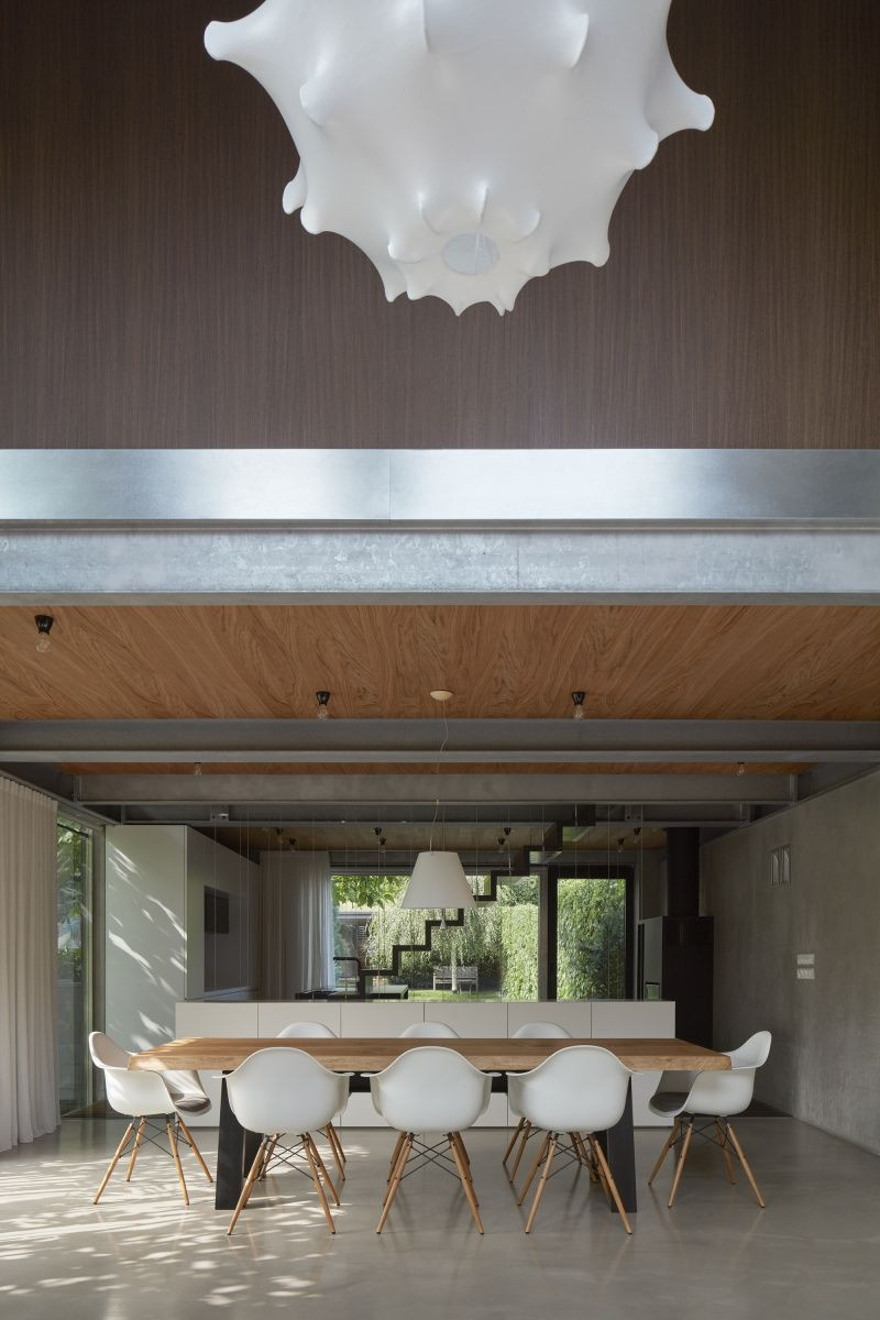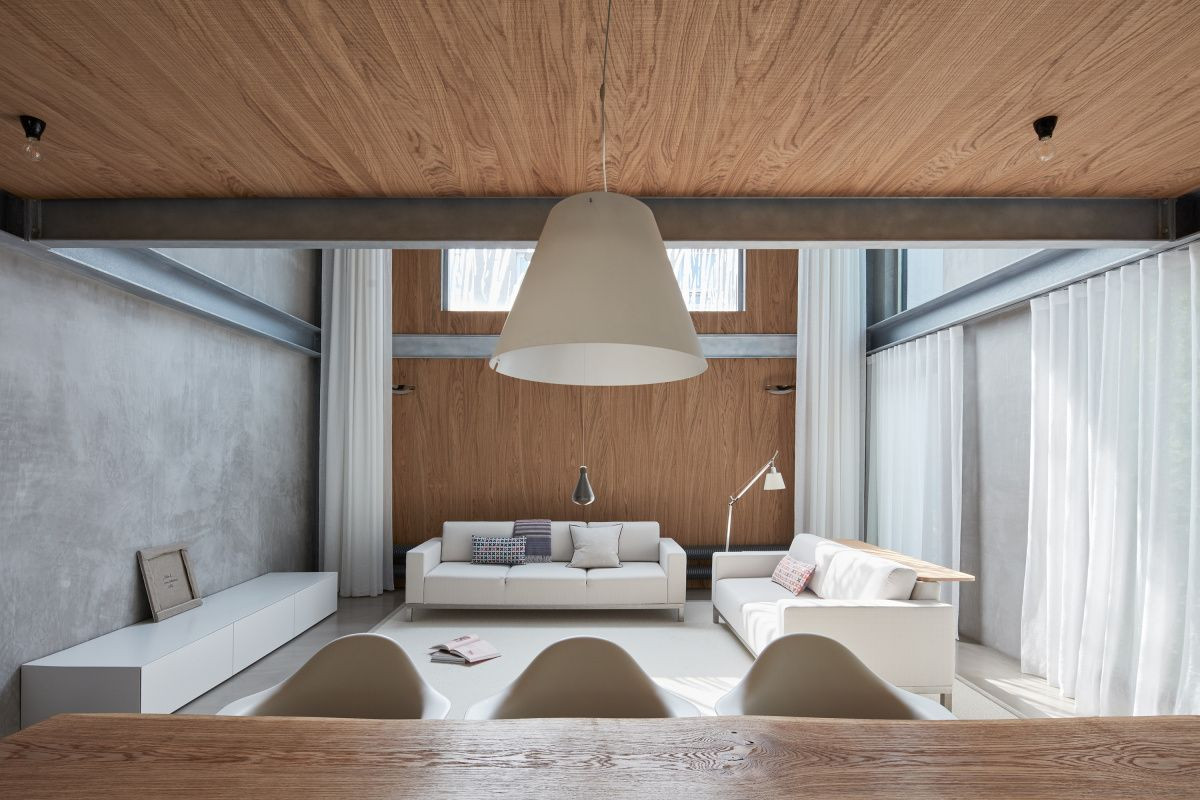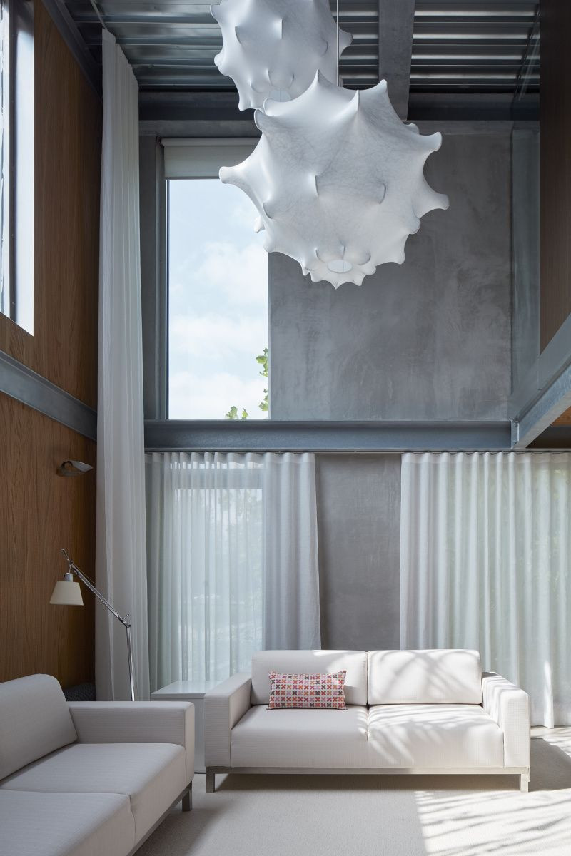 Dům původně neměl žádné záclony oken – nehodily by se do pragmatického programu. Okenní tabule clonila pouze vyřezávaná průsvitná folie. Nyní už bílé záclony do interiéru přece jen pronikly a – nutno dodat – prostoru nijak neuškodily. Nejvýraznějším zásahem „faceliftu“ interiéru je dubový obklad odhalených stropů. Dřevo proměnilo působení prostoru zcela jasně. Zároveň také vyřešilo problém s akustikou.