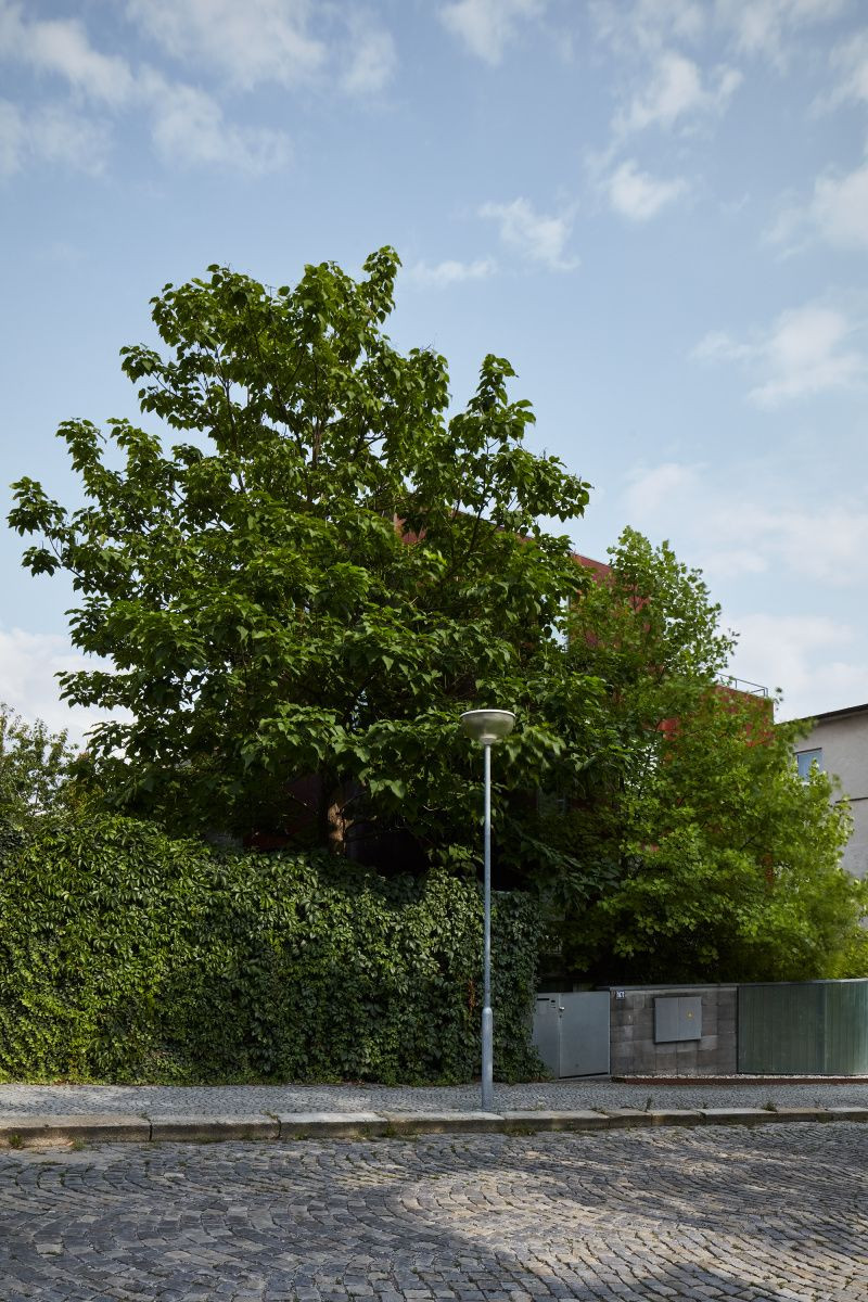 Dům stojí na komplikované parcele nedaleko městského centra. Místo bylo považováno za nezastavitelné. Jde o velmi úzký pruh pozemku navazující na zástavbu domů, který se nachází na rohu hlavní silnice, odkud navíc severním směrem mírně stoupá. Z těchto důvodů bylo nutno postavit vertikální stavbu, neboť místo na zemi jednoduše scházelo. Dům jej šetří přímým napojením na svého souseda, kterému výškově odpovídá, a také umístěním na samou hranu uliční čáry. Zde stojí za zmínku skvělý detail – kopilitová stěna v parteru se v rohu parcely mění v protažené průsvitné oplocení, na které pak navazuje mohutnější stěna z tvárnic polévaných betonem.