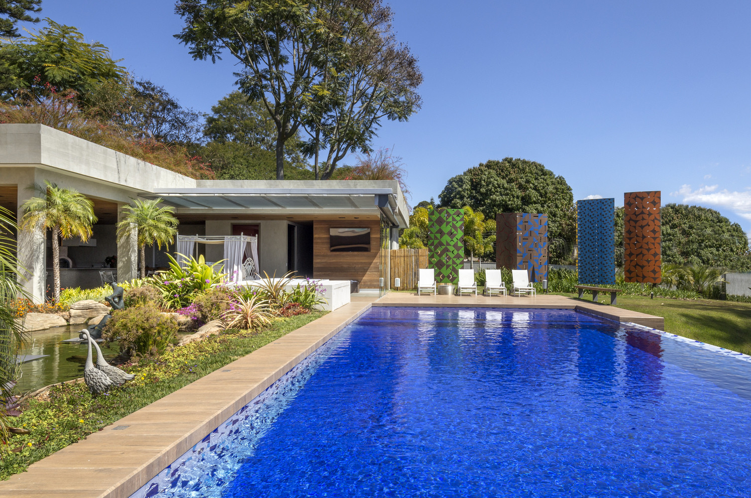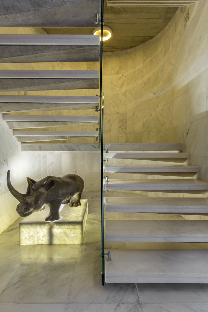 V přízemí stavby najdeme také rozměrnou mozaiku od předního brazilského umělce Athose Bulcão (1918-2008) – jde přitom o jeho největší umělecké dílo v soukromé rezidenci na světě. Autor revitalizace Leme navrhl také všechny zahradní úpravy a novou wellness část se společenskou místností, spa, vinným sklípkem a infinity bazénem.