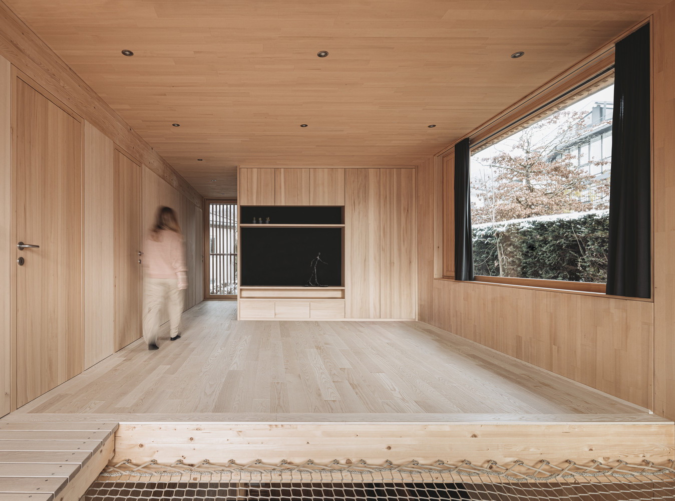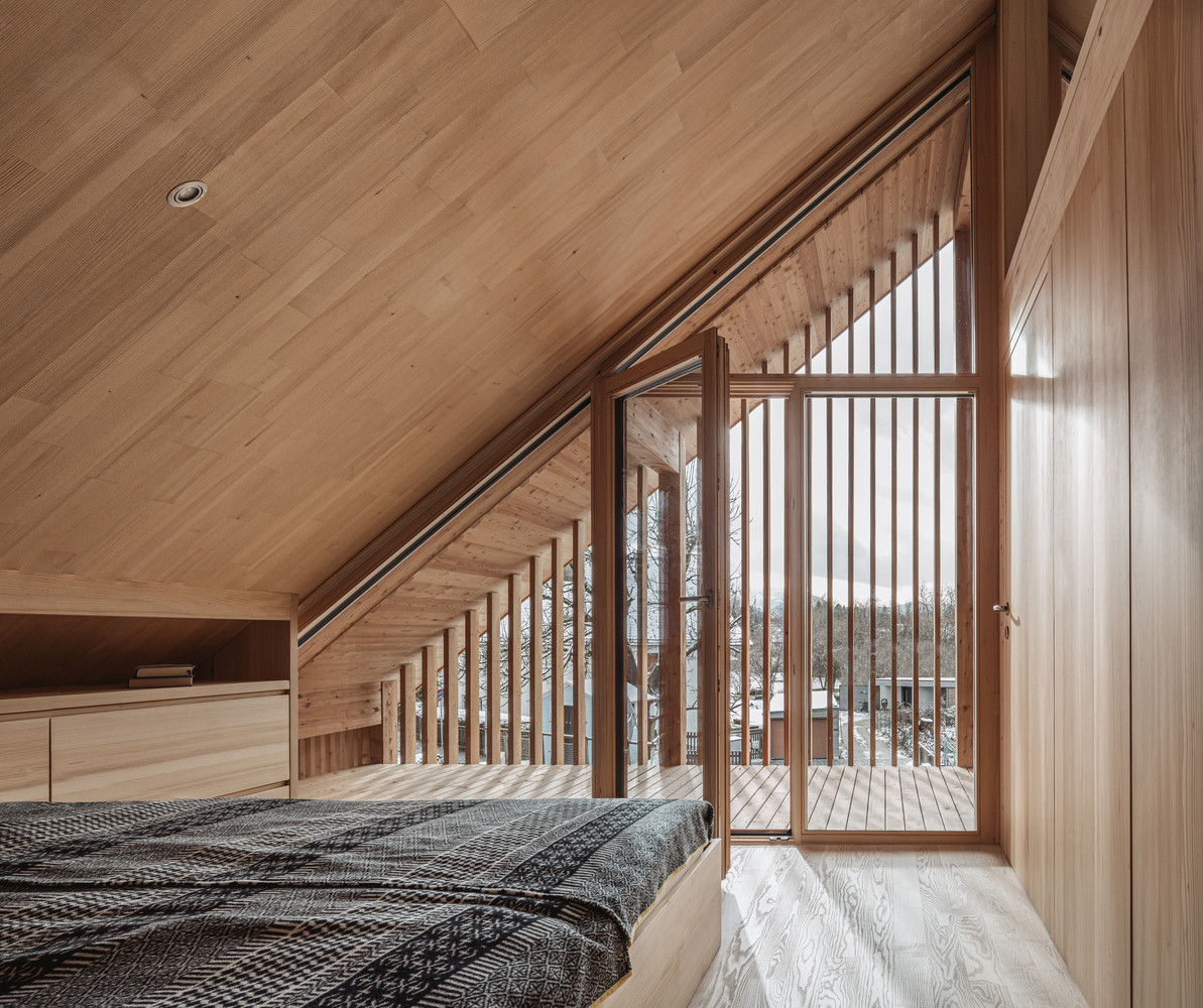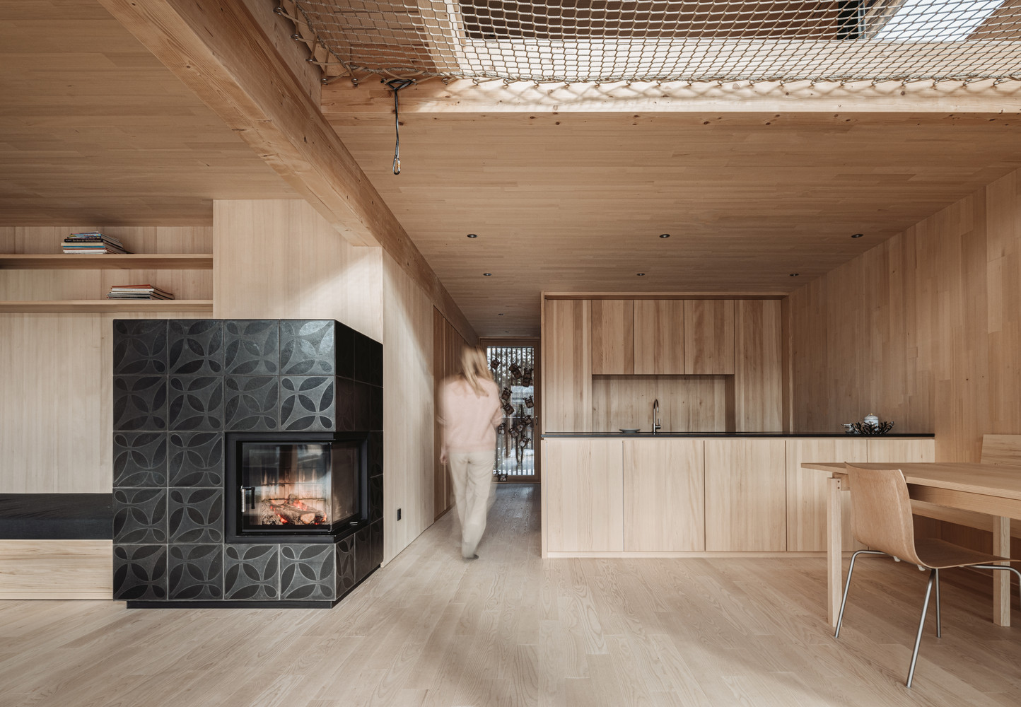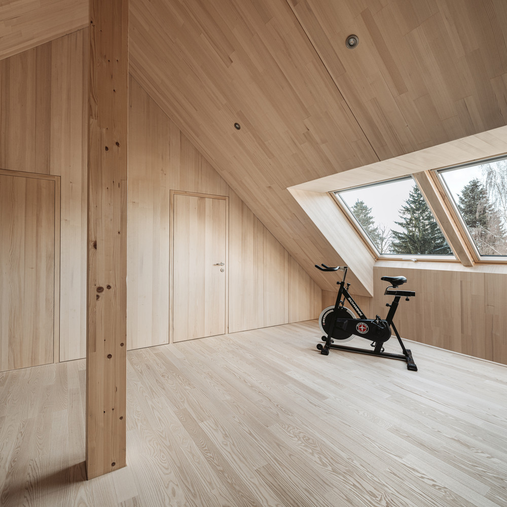 Dřevo je dominantním materiálem jak exteriéru, tak i interiéru. Dřevěné schody ladí s podlahou a obložením stěn a vše doplňuje převážně dřevěný vestavěný nábytek v přirozené povrchové úpravě. Se světlým dřevem tak kontrastuje pouze pár černých prvků, jako je piano, kamna nebo závěsy.