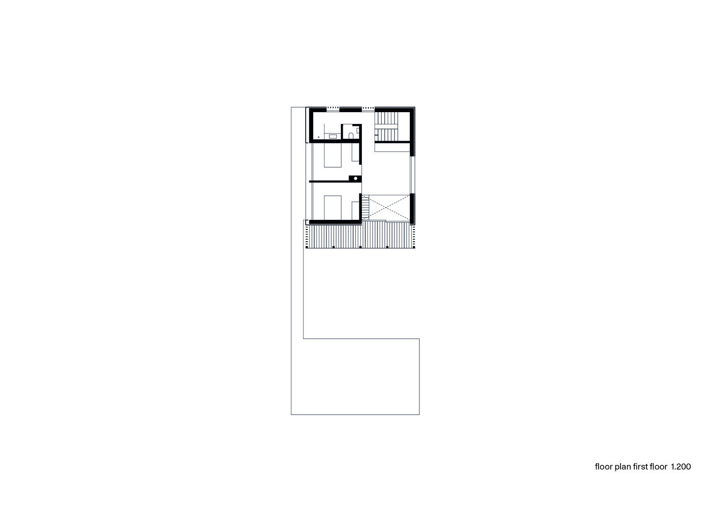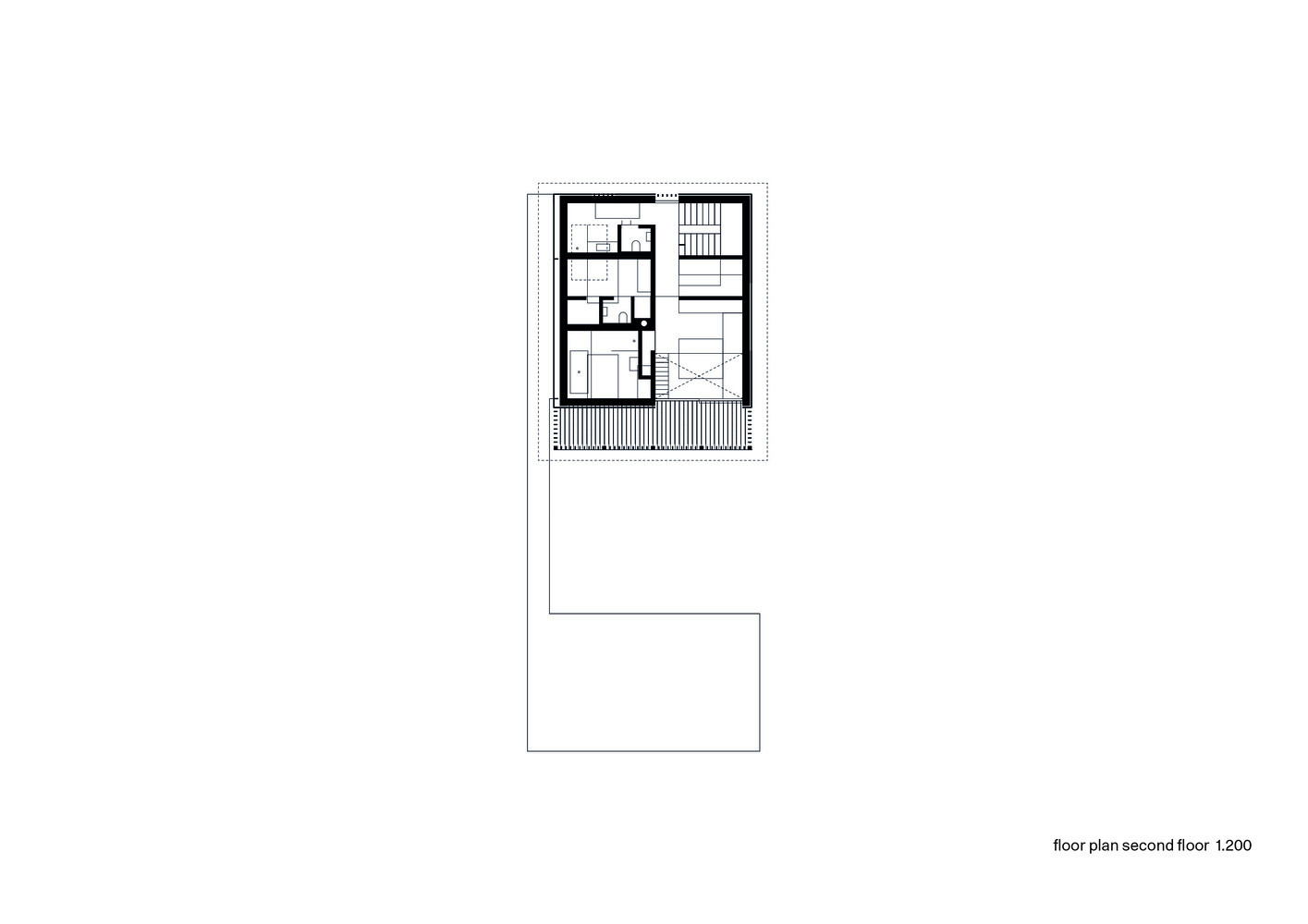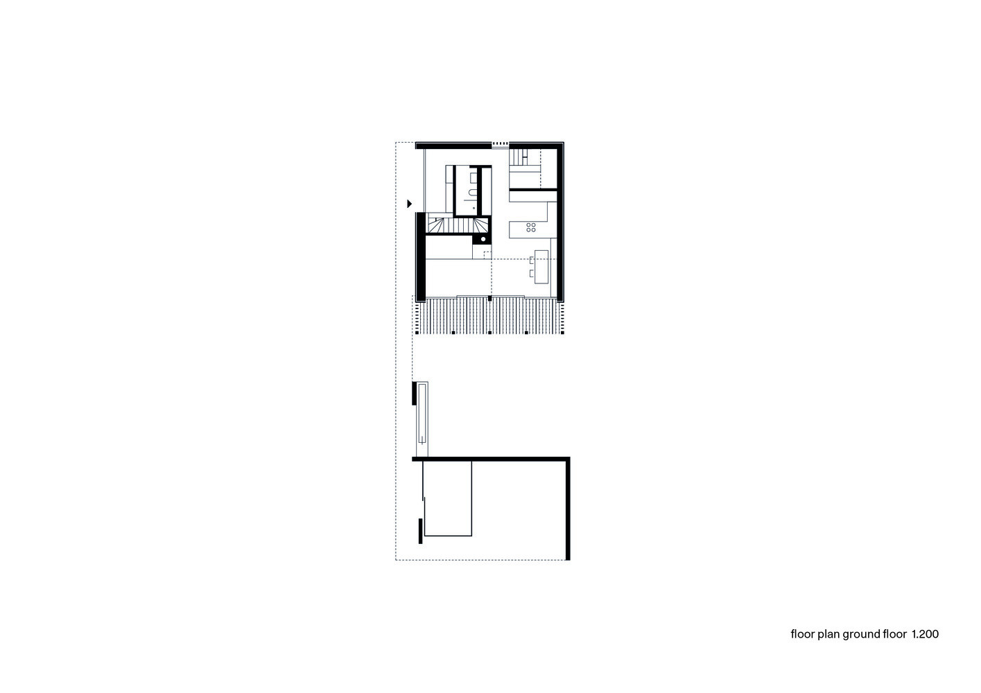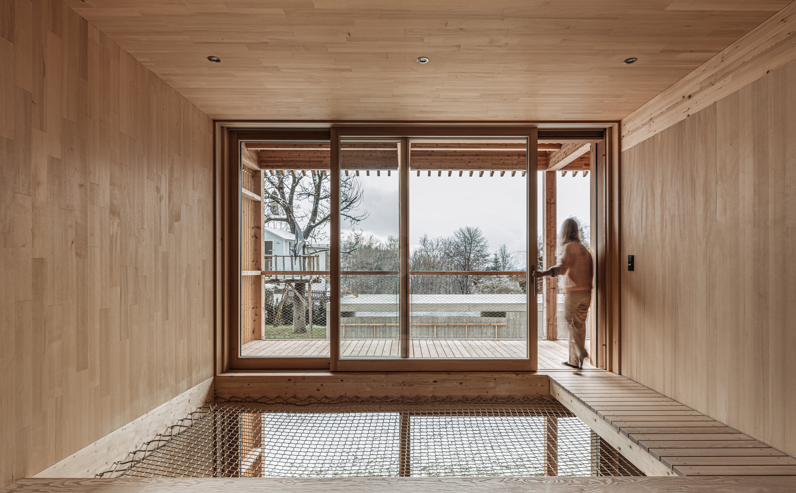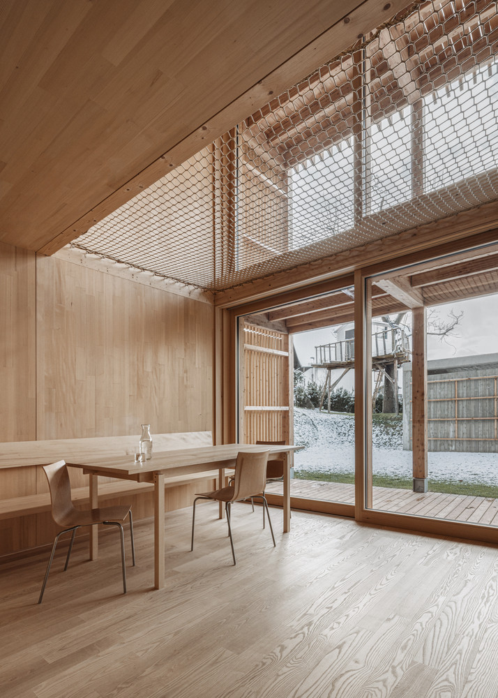 Dům je umístěn v mírném, západně orientovaném svahu a pod třemi nadzemními patry se nachází ještě suterén. Přízemí zahrnuje hlavní obývací prostor s kuchyní a koupelnou. Téměř cele prosklená stěna zaručuje bohatý přísun denního světla. Nad jídelním stolem navíc „chybí“ strop, který supluje síť pro relaxaci a hry dětí, takže se světlo může volně šířit do vyššího patra, kde jsou dvě ložnice s koupelnou. Nevyšší patro osvětlují střešní okna a je téměř bez příček, pouze skleněné zábradlí chrání před úrazem na schodech.