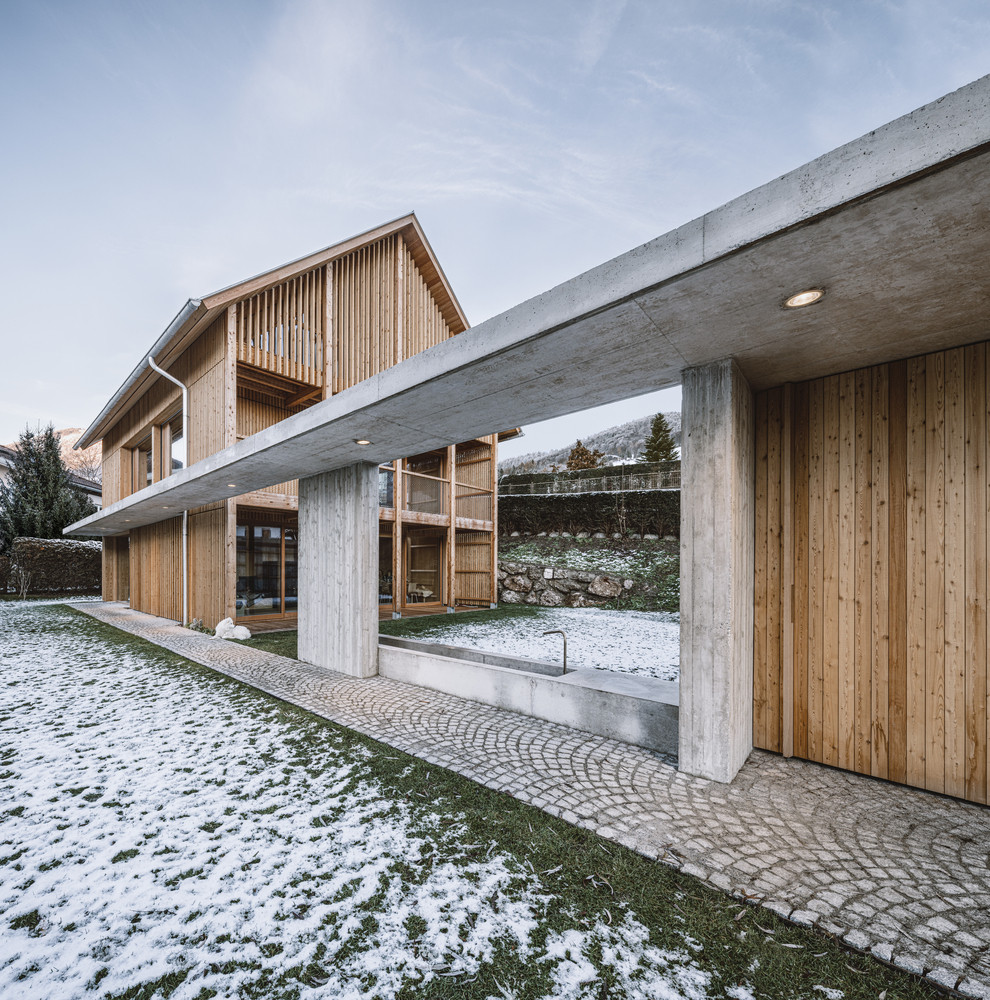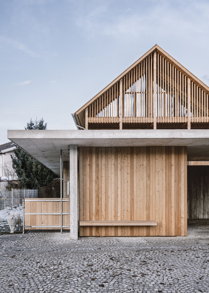 Na mírně svažitém pozemku poblíž Salzburku navrhlo mladé lokální studio Dunkelschwarz rodinný dům z přiznaných materiálů, který svou formou navazuje na tvarosloví sousedních staveb, překvapí však originálně zpracovaným interiérem.