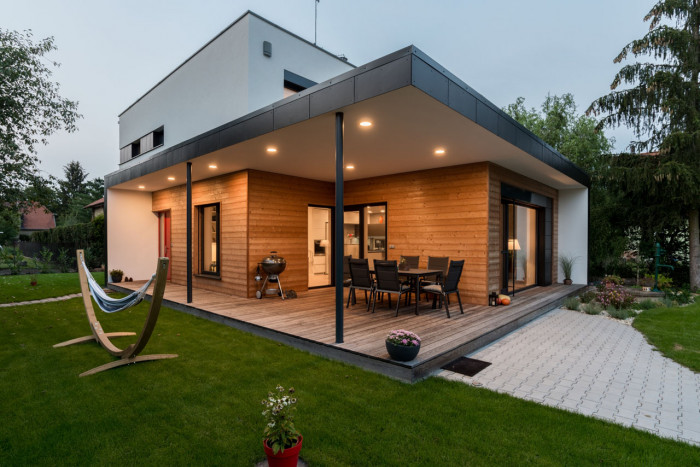 Pasivní rodinný dům od ateliéru ARCHCON nabízí prostornou krytou terasu