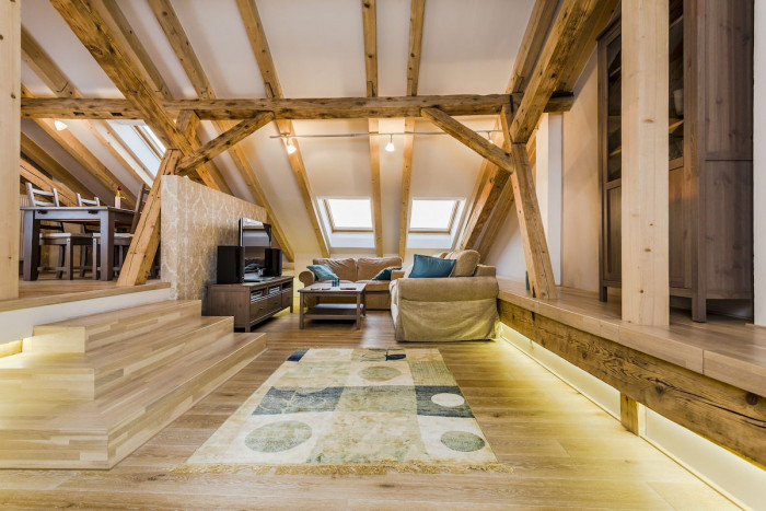 Podkroví měšťanského domu nabízí po rekonstrukci odhalené trámy a prosklenou koupelnu