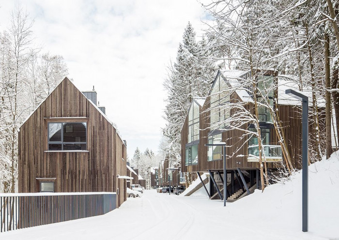 Dřevěná rezidenční čtvrť v příkrém svahu
