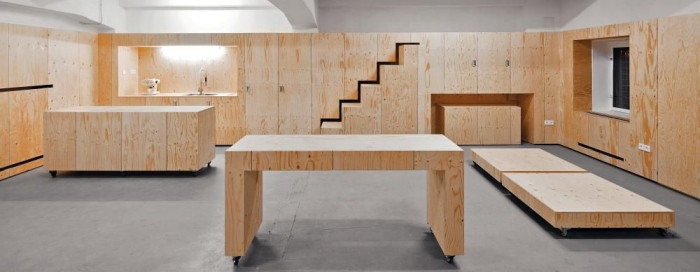 Minimalistický dřevěný interiér galerie v Bratislavě