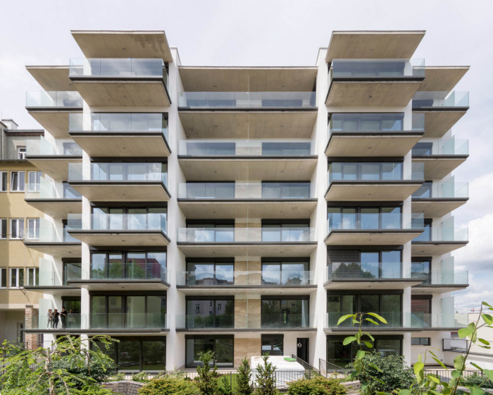 Detaily z travertinu a půlkruhové balkony zdobí bytový dům Šumavská v Brně od studia RAW