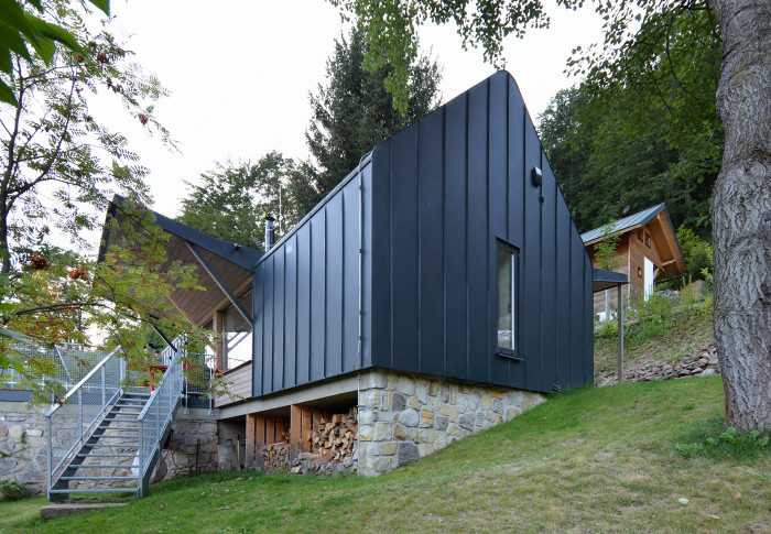 Do svažitého terénu Krušných hor usadilo studio New Work horskou chatu s černým pláštěm