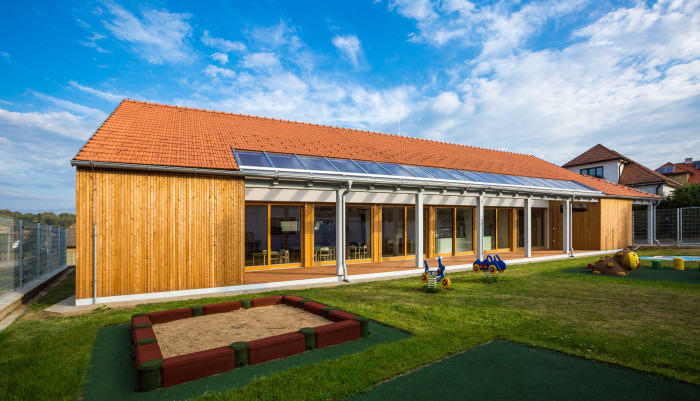 Studio ARCHOO pojalo šetrnou školku v malé obci na Vysočině jako moderní prosvětlenou stodolu
