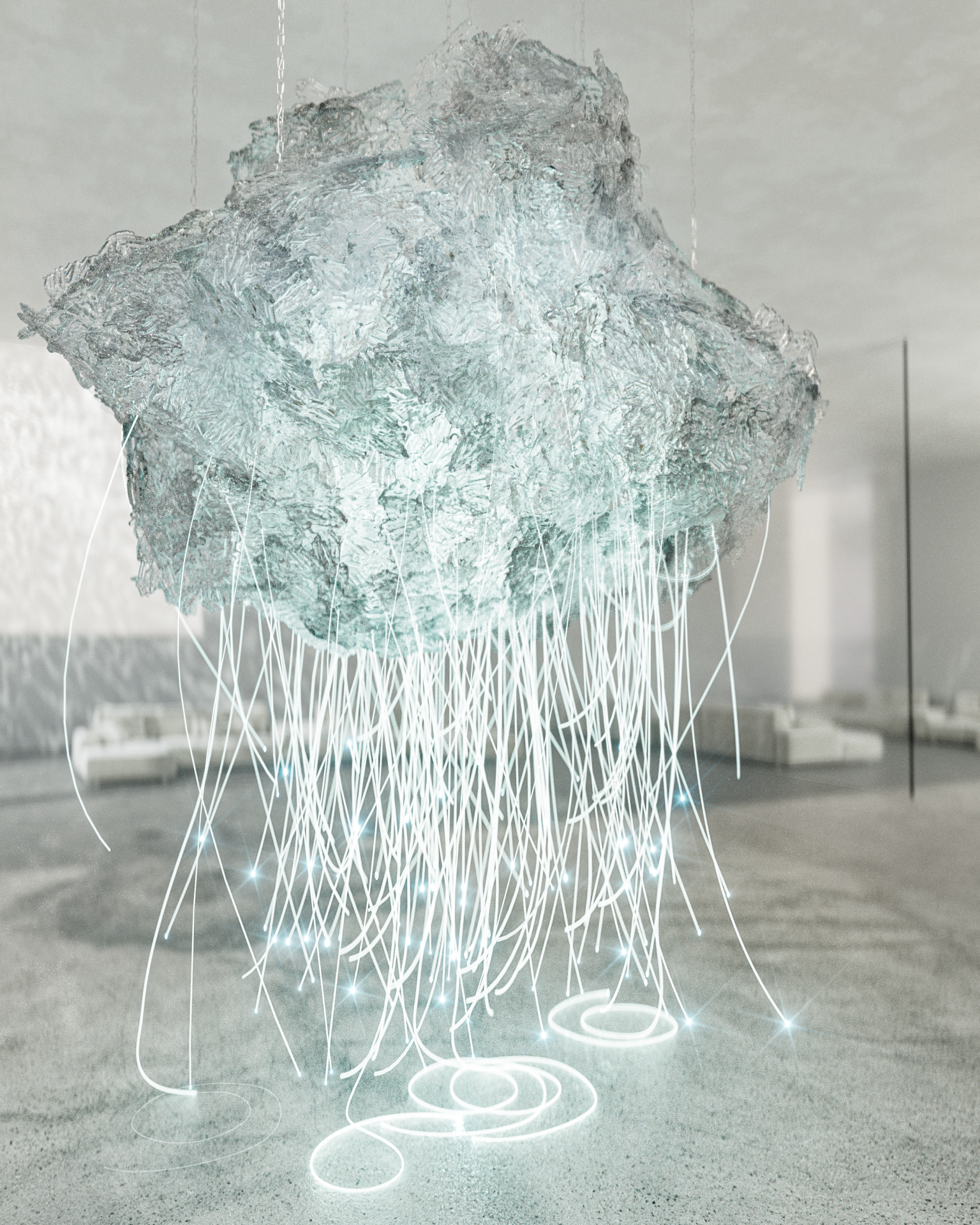 Čtyřmetrová pulzující instalace ze skla a optických vláken od Maxima Velčovského „Cloud“ bude příští týden odhalena na prestižním milánském veletrhu Salone del Mobile: Euroluce