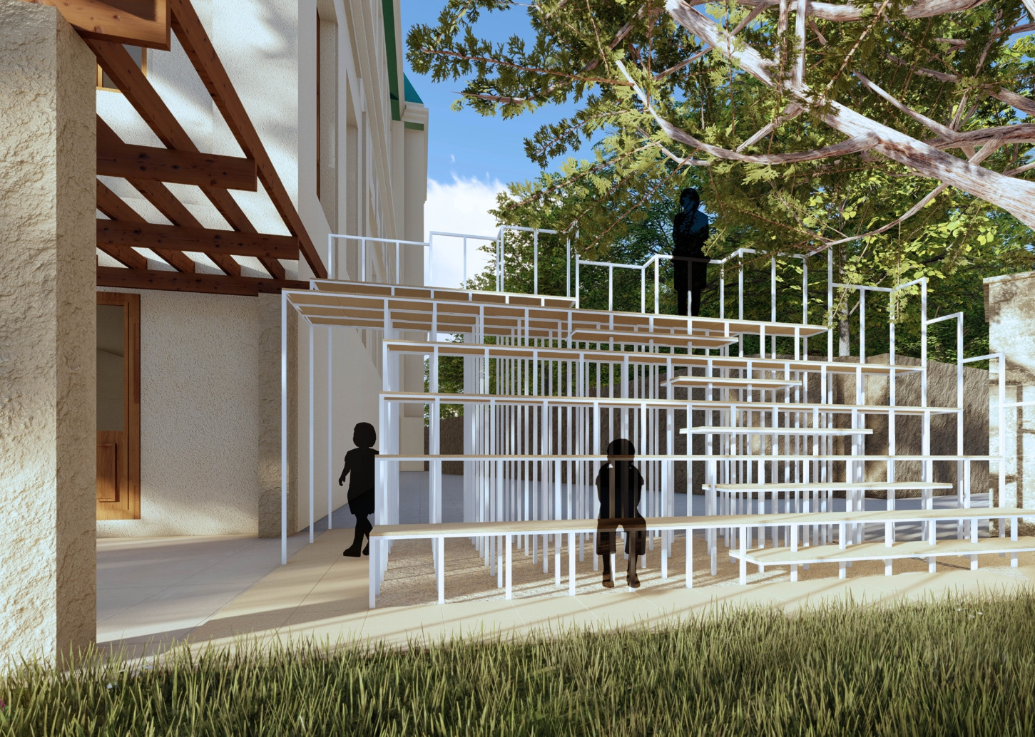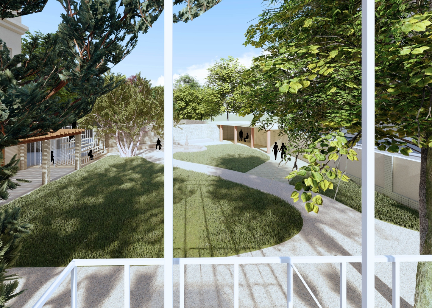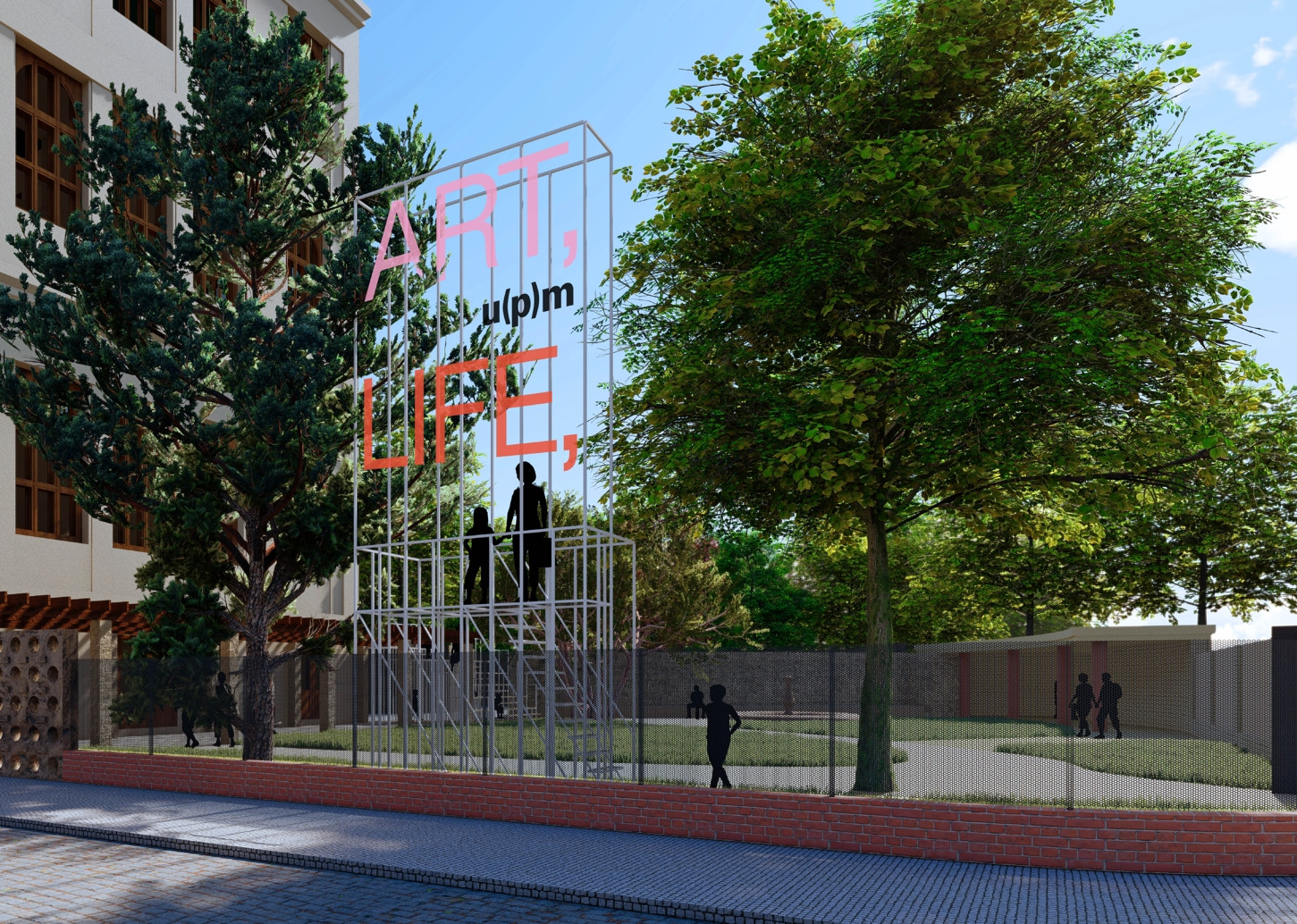 Návrh myslí také na exteriér neboli zahradu, kde vzniká prostor pro odpočinek a workshopy. Do zahrady je umístěna vyhlídková věž, která kromě toho, že je svěžím designovým prvkem, signalizuje kolemjdoucím, že UPM ožilo. Pomyslnou třešničkou na závěr je grafická identita, která celý koncept důstojně podtrhává. Hlavním motivem je sousloví „ART, LIFE,“ které označuje UPM. Čárka za slovem LIFE symbolizuje nedořečené a vybízí k dosazení potřebného obsahu v libovolné formě (text, hashtag, obrazové sdělení), což však není podmínkou.