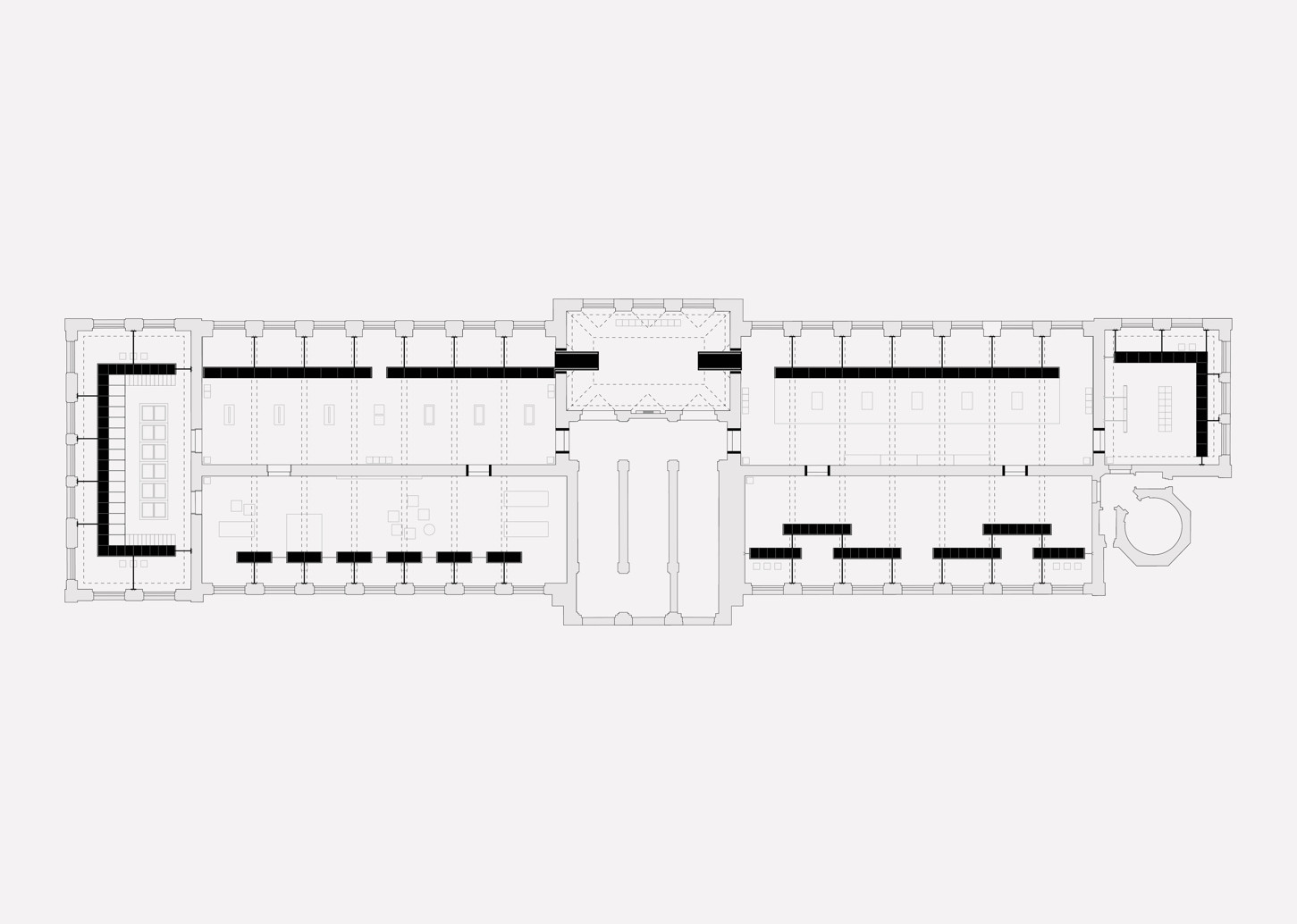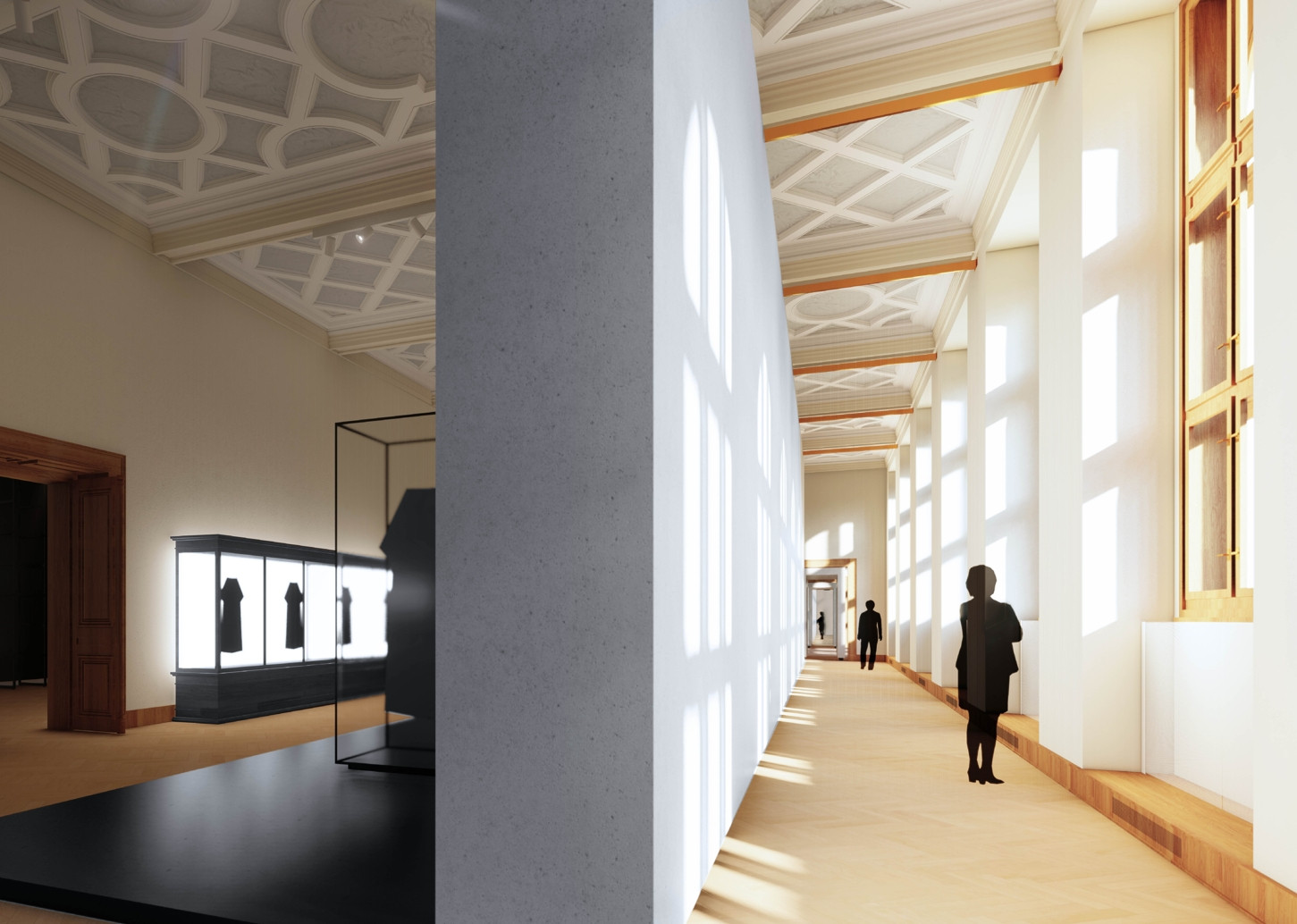 Výstavní, která se nachází ve vnitřní části, disponuje kontrolovanými světelnými podmínkami. Odpočinková, vnější, využívá potenciál přirozeného světla díky otevřeným výhledům a dennímu světlu. Tyto dvě oblasti jsou rozděleny modulárním systémem, který v kontrastu s historickou povahou prostoru vytváří unikátní spojení původního a vloženého. Jednotlivé sály jsou dále řešeny individuálně, aby splňovaly své dílčí účely.