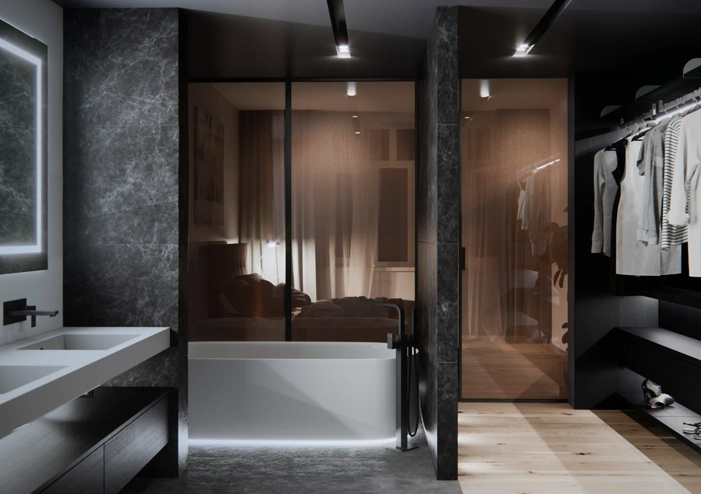 Dveřní rám z eloxovaného hliníku lze povrchově upravit dle různých vzorníků barev a k výběru je i dostatek typů skel včetně neprůhledných, které dokážou vytvořit intimní prostředí a dveře tak lze smysluplně použít pro oddělení koupelny nebo šatny od ložnice.