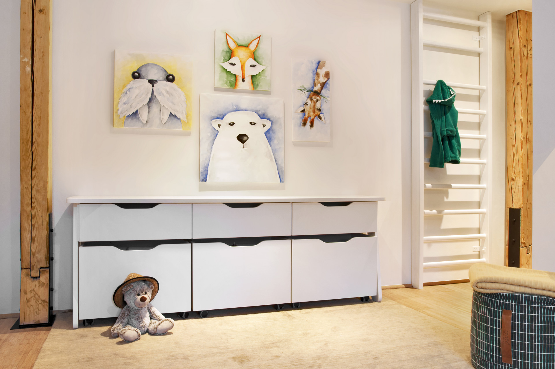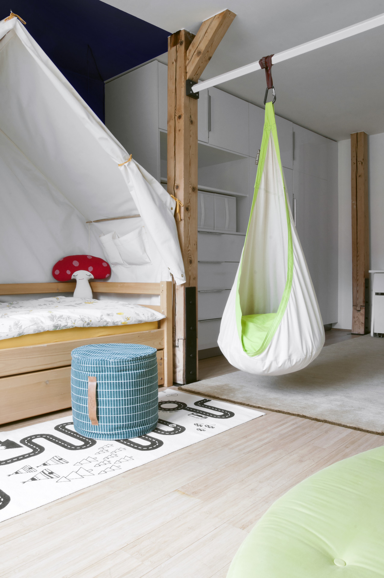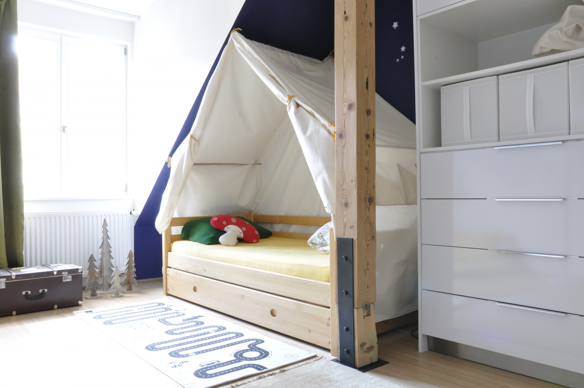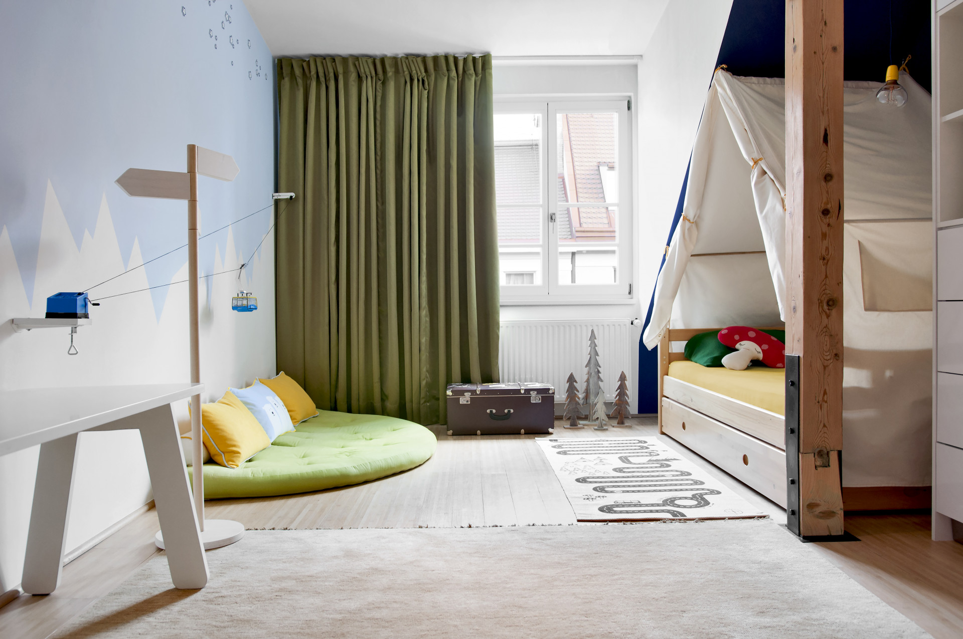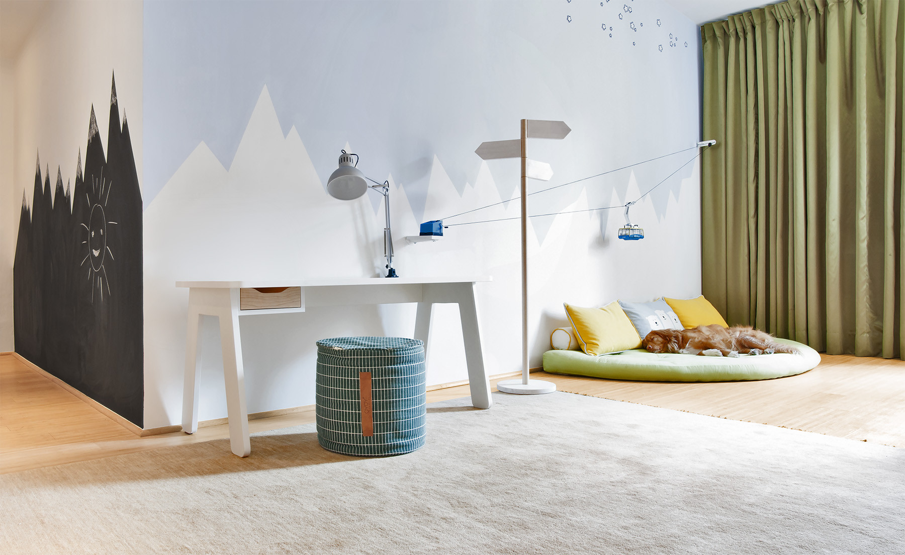 Vedle ložnice se pak nachází dětský pokoj nejmladšího člena rodiny – chlapce předškolního věku. „V návrhu dětského pokoje jsem se snažila co nejvíce odrazit charakter a záliby chlapce. Jeho lásku k horám vyobrazují reliéfy jejich vrcholků na stěnách pokoje, přičemž část jich je vytvořená z černé tabulové barvy, na kterou lze kreslit. Oblíbené stanování pak v pokoji připomíná postel ve tvaru stanu, která zároveň slouží jako dokonalá „schovka“,“ popisuje designérka. Ukazatel ve tvaru rozcestníku přirozeně rozděluje pokoj na dvě zóny – odpočinkovou a hrací.