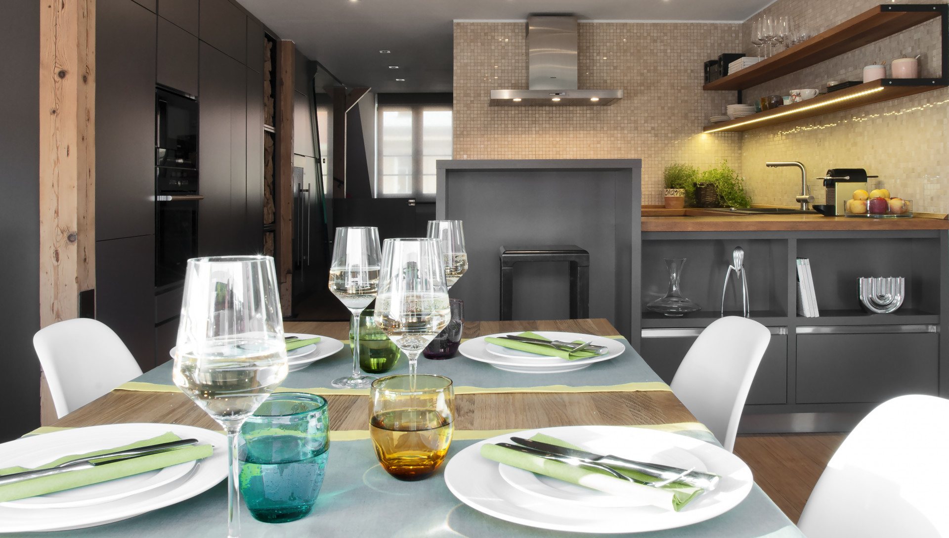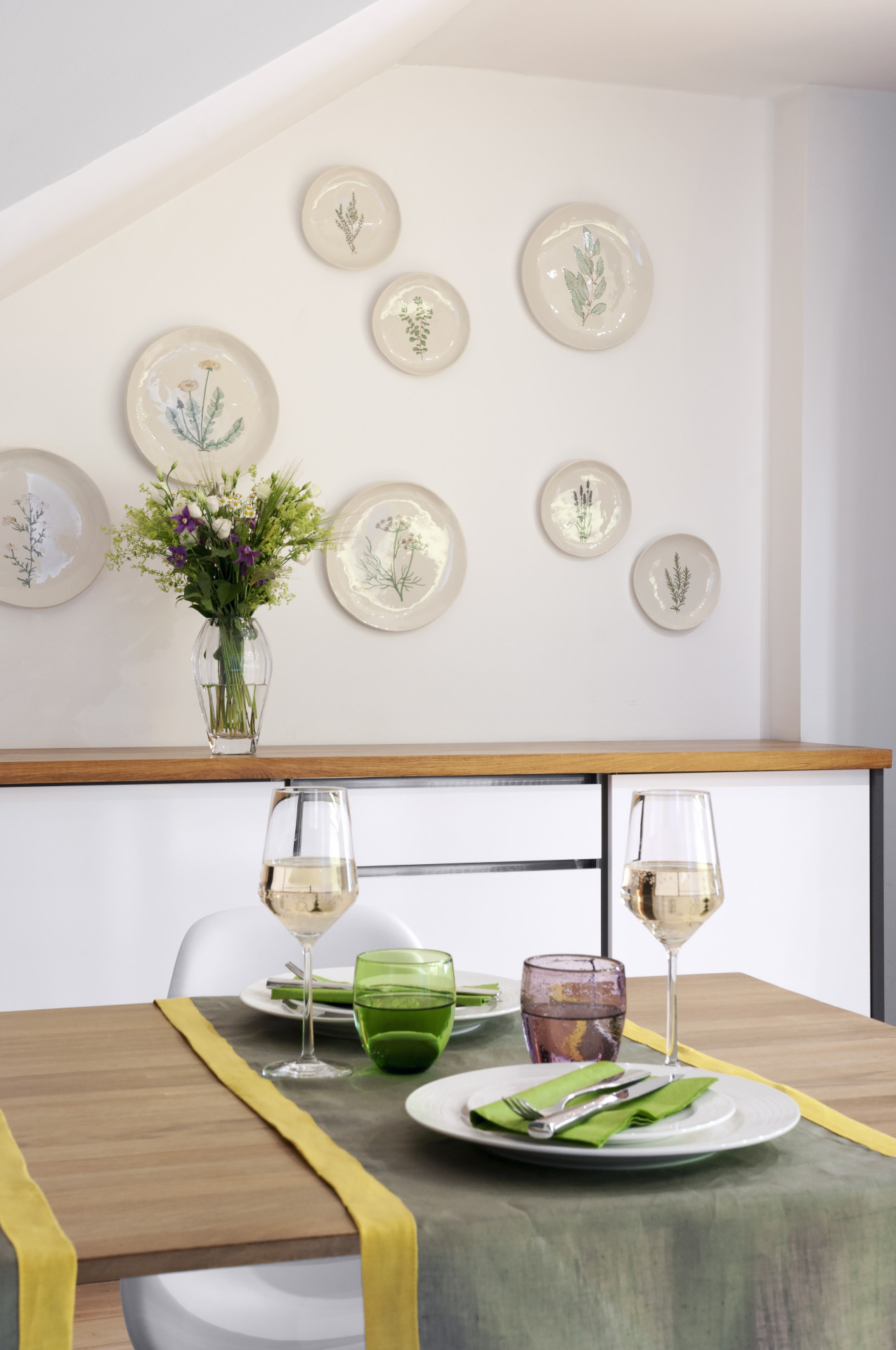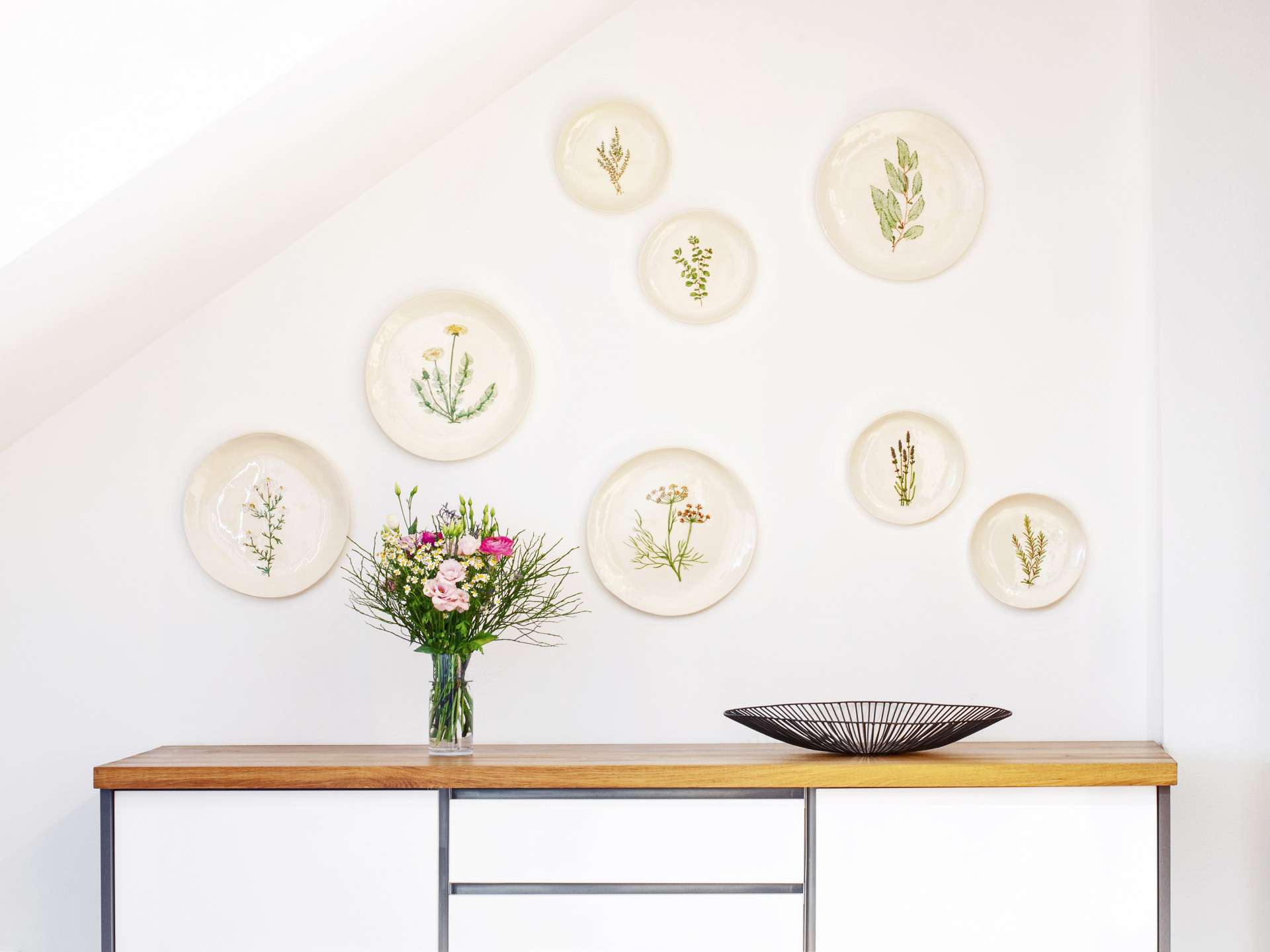 Do nově zrekonstruovaného bytu se vchází z předsíně do velkého otevřeného prostoru, který tvoří jídelna s kuchyní. Jídelní kout se stolem umístěným po levé straně v podkrovní šikmině, projasňují dekorace na zdi v podobě různě velkých keramických talířů s originálními ilustracemi lučního kvítí a bylin. Ty podle představy designérky navrhla ilustrátorka Markéta Jinochová a vyrobila majitelka keramické dílny Ema má mísu Bára Diduchová. Srdcem bytu je poměrně velká kuchyně ve tvaru U a vestavěný nábytek postupně přecházející do obývací části. Stěny za kuchyňskou linkou jsou obložené mozaikovým obkladem laděným tón v tónu k dřevěné pracovní desce. Absenci horních skříněk nahrazují dvě police ze dřeva se světelnou rampou, což celý prostor odlehčuje a mozaika tak může prostupovat až ke stropu.