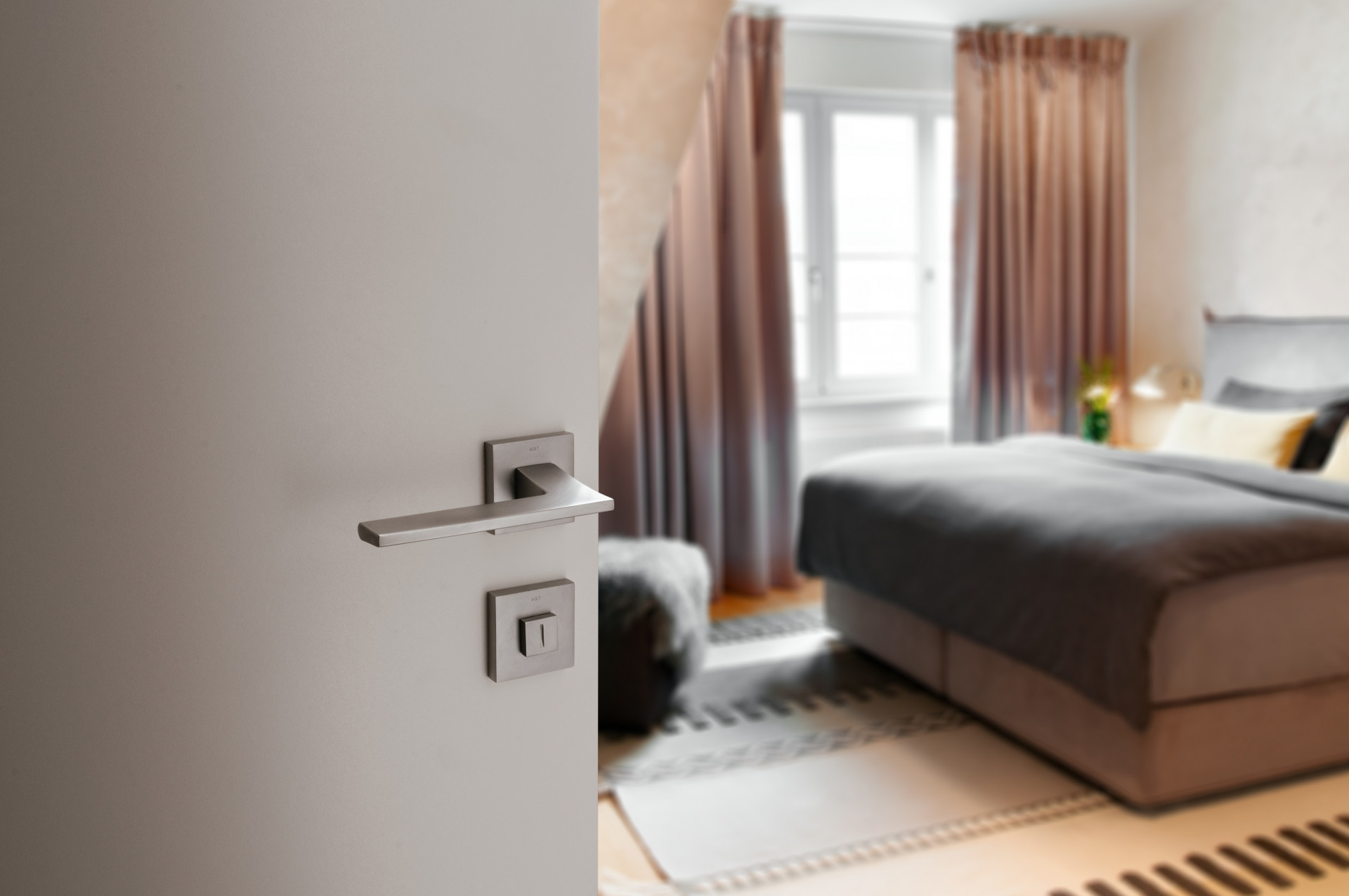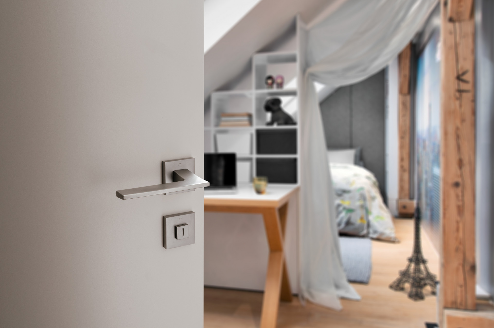 Obývací pokoj je stejně jako celý interiér laděný do přírodních materiálů a barev. Dřevo, sklo, lícové zdivo, dub a dominantní barvy šedou a béžovou přirozeně doplňují bílé dveře osazené klikami TERRY od českého výrobce M&T, které svojí povrchovou úpravou zapadají do celkového barevného konceptu interiéru. „Do svých realizací využívám zásadně kliky z dílny M&T – jsou moderní, a přitom nadčasové, ale především kvalitní, což je pro mě velmi důležité. Do bytu jsme společně s klienty vybrali kliky TERRY v povrchové úpravě broušený nikl, které jim padly nejen do oka, ale i do ruky,“ říká Kamila Jarkovská. Roman Ulich, hlavní designér společnosti M&T, k tomuto modelu dodává: „Přestože klika TERRY působí na první pohled jako hranatá, zadní strana rukojeti skrývá oblé křivky, aby při úchopu příjemně padla do ruky. Ergonomie kliky je pro její pohodlné používání bezpodmínečně důležitá, a proto je jedním ze zásadních aspektů, kterému věnujeme při vývoji nových modelů pozornost. Co se týče zvoleného povrchu, matný nikl nejenže svojí jemnou barevností skvěle zapadne do jakéhokoli stylu interiéru, ale navíc na kování opravdu vydrží, protože se jedná o tvrdou kovovou vrstvu nanesenou galvanickým pokovením.“