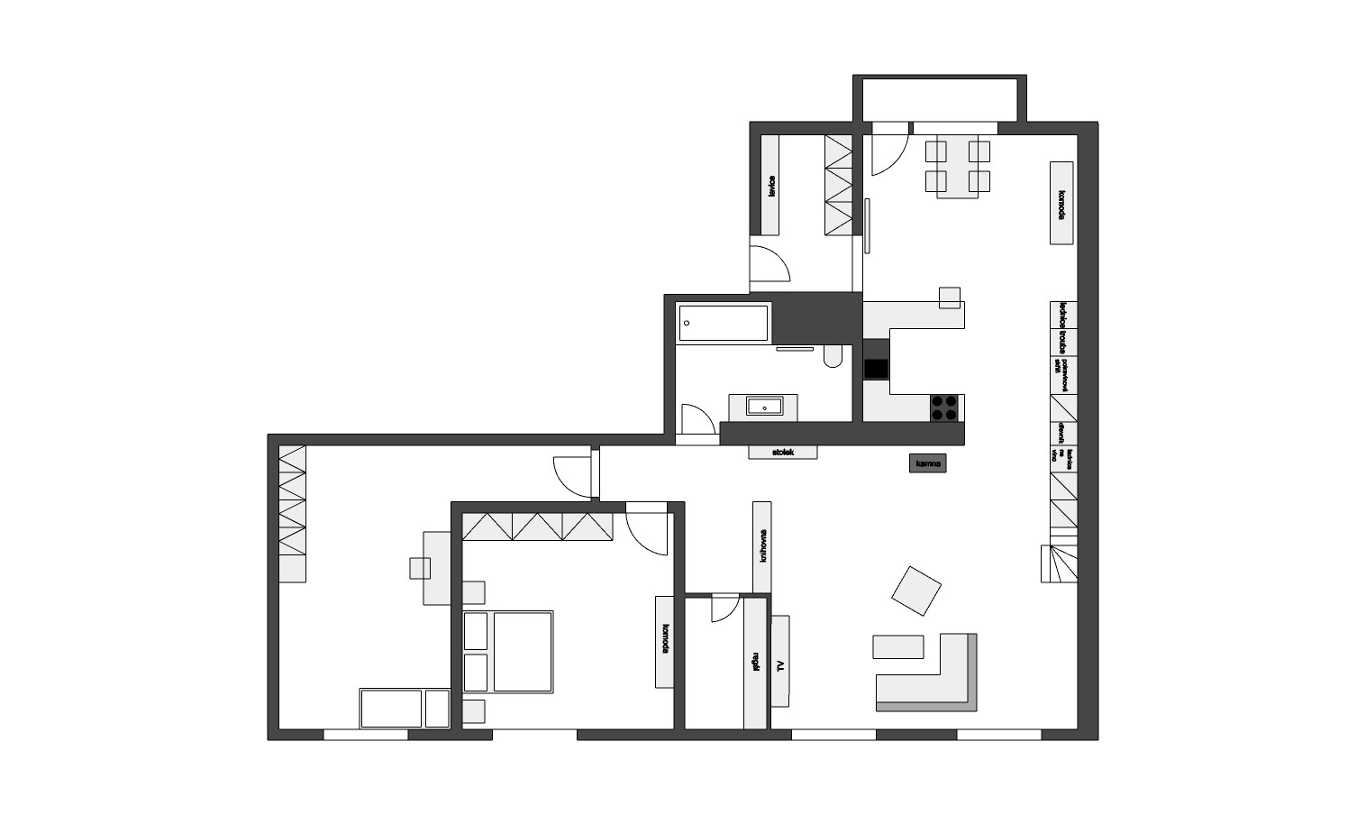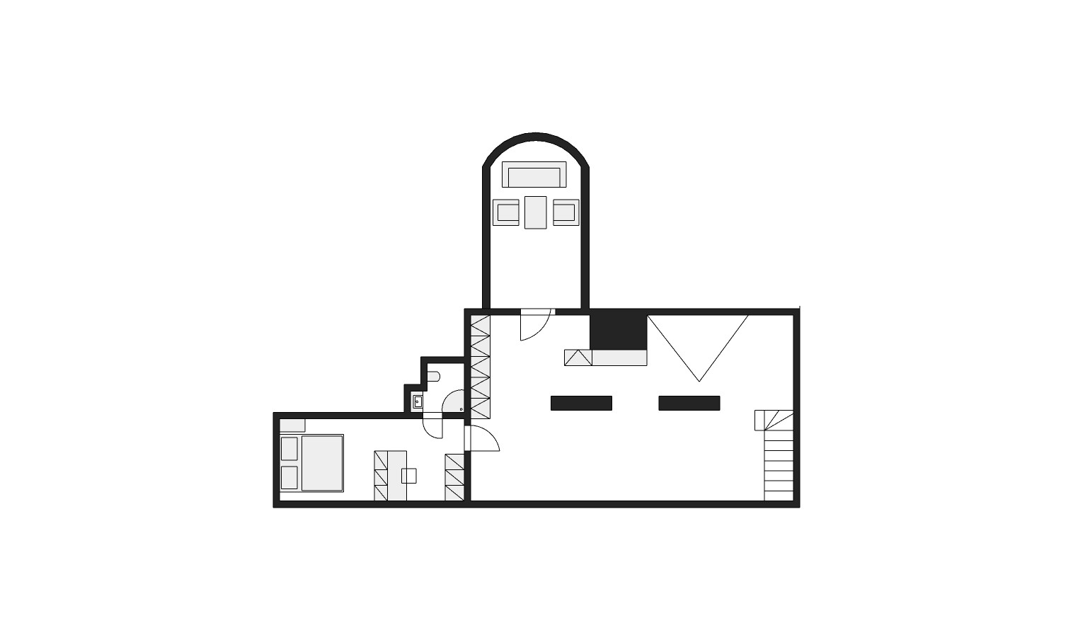 Kuchyň s obývacím pokojem plynule spojuje na míru vyrobená vestavěná šedá skříň s vinotékou a efektním zásobníkem na dřevo, který stoupá vzhůru. V prostorném obýváku se vyjímá prostá cihlová zeď a dominující kamna na černé dlažbě, která kontrastuje se světlým dekorem dřeva. Právě v těchto místech se původně nacházelo točité schodiště, které se rozhodla designérka odstranit. Toto rozhodnutí přineslo velkou výzvu v podobě nutnosti vypořádat se s nevyužitým otvorem ve stropě. „Původní točité schodiště uprostřed obývacího pokoje, zabíralo hodně prostoru, proto jsem navrhla schodiště podél stěny obývacího pokoje. Na původní místo jsem umístila kamna a nad kamny jsme vytvořili pochozí skleněný strop,“ sděluje designérka největší úskalí rekonstrukce. Vznikl tak zajímavý průhled a propojení dolního patra s horním.