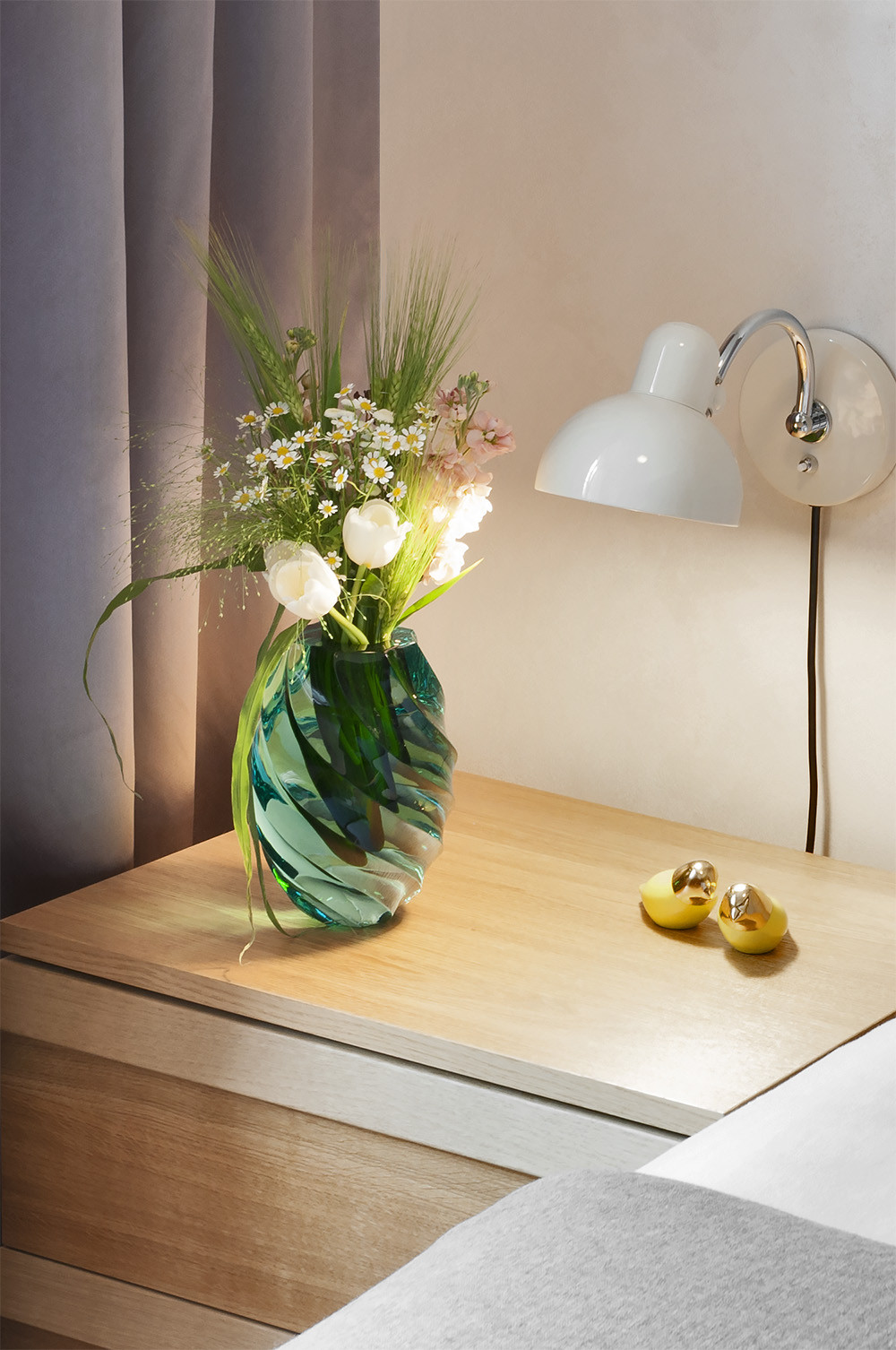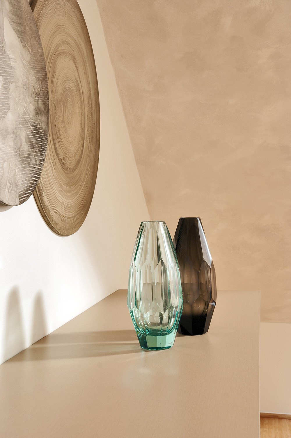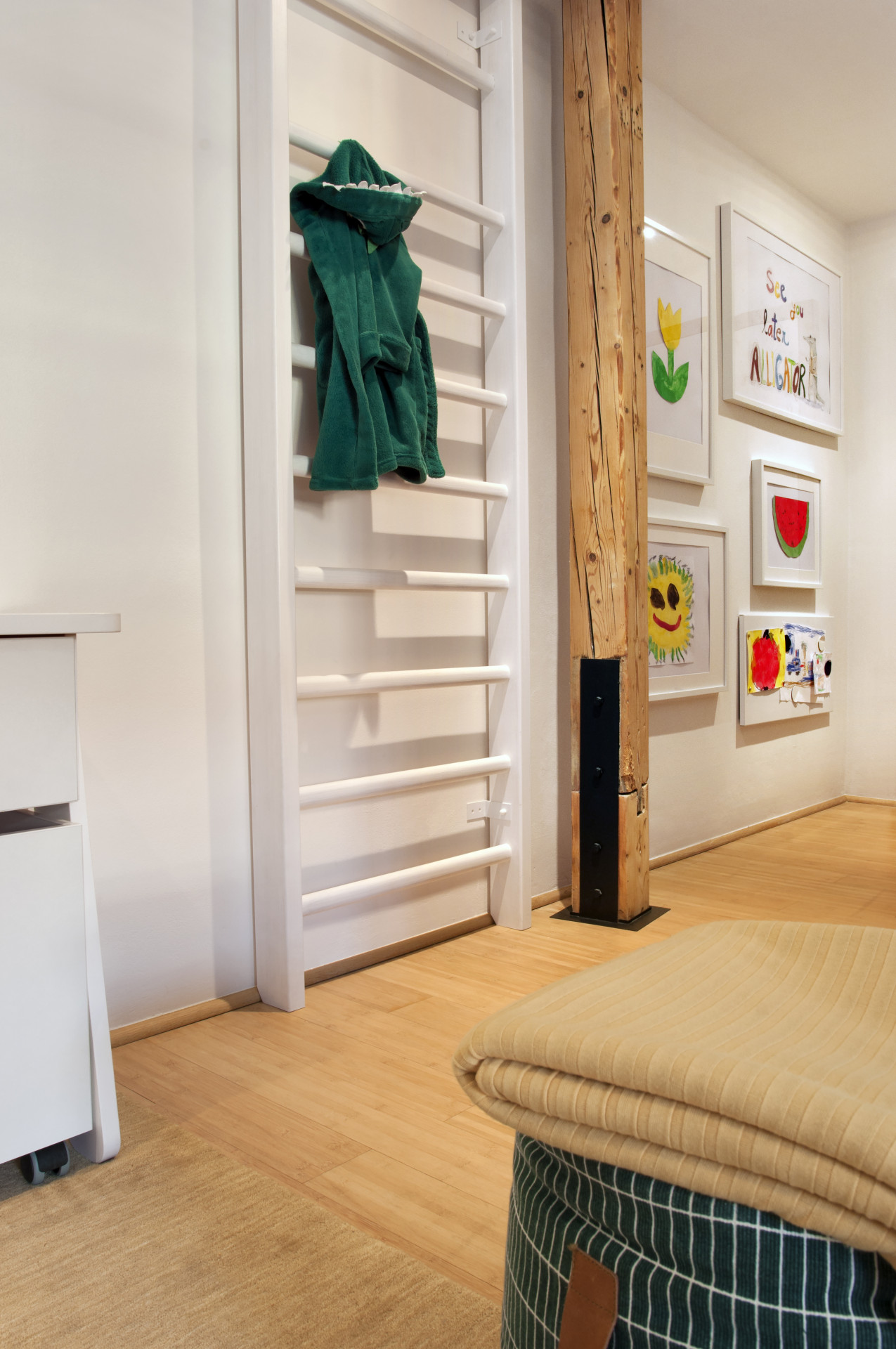 Stejné barevné spektrum pak opisuje také ložnice majitelů, která je dále společně s přilehlým dětským pokojem součástí prvního podlaží mezonetového bytu. Pro stěny i strop ložnice designérka zvolila efektní béžovou stěrku, která za denního světla drobně pableskuje a tvoří dechberoucí podívanou. Ložnici vévodí velká šedá čalouněná postel se sametovými polštáři, jež jsou i s postelí vyrobené na zakázku. Opakující se šedá je dále použita na solitéru v podobě taburetu, na kterém ledabyle leží šedá kožešina, jež umocňuje odkaz k přírodě. Světlou dřevěnou podlahovou krytinu částečně zakrývá asymetrický koberec taktéž v zemitých barvách. Na komodě pod zkoseným stropem našly místo broušené vázy ze sklářské dílny Moser a stěnu nad ní zdobí rustikální keramické artefakty z cest majitelů po Itálii.