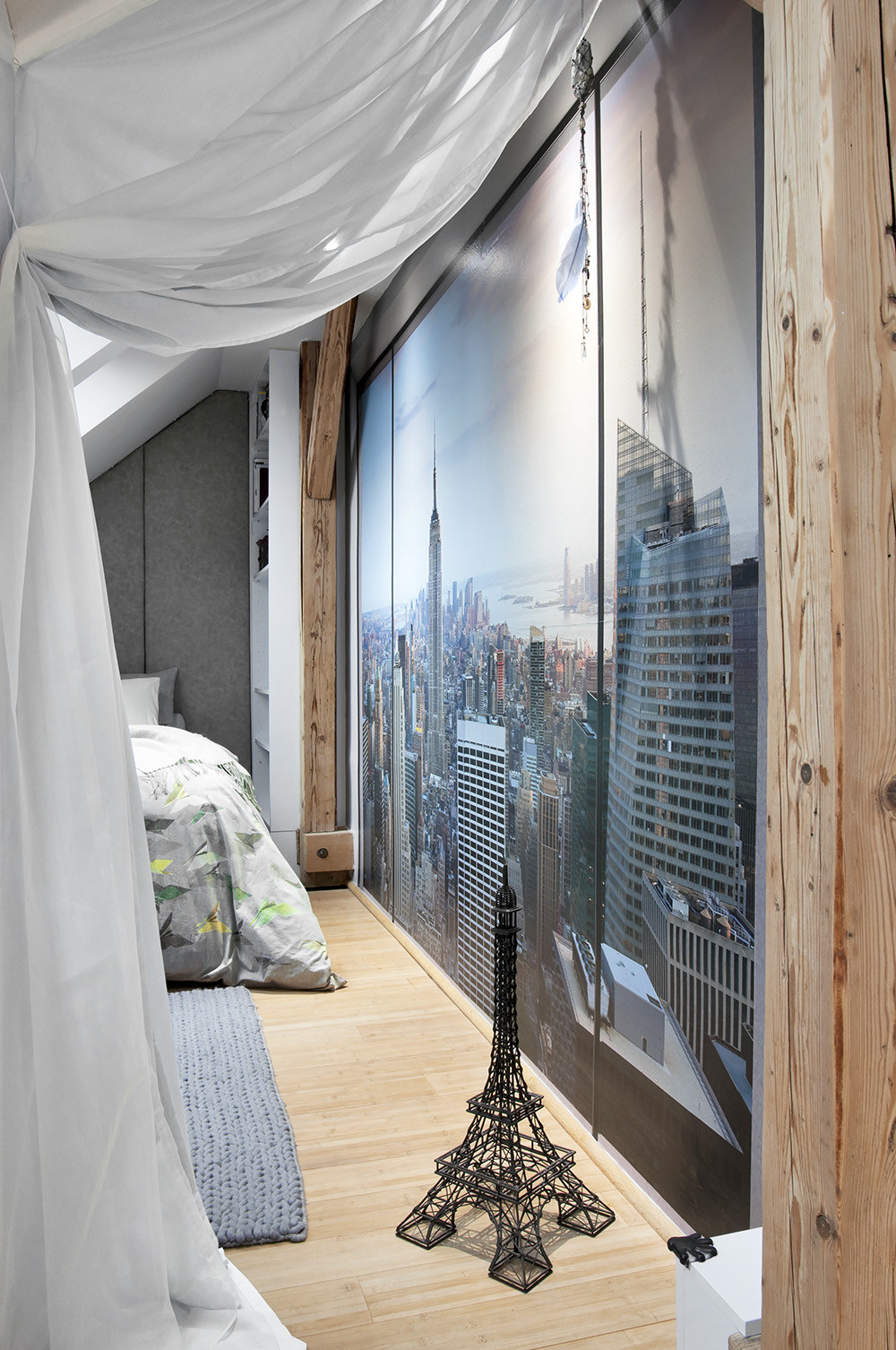 V horním patře, do kterého se vstupuje po dřevěných schodech z hlavního obytného prostoru, se nachází otevřená pracovna, pokoj dospívající dcery majitelů a také terasa pro příjemný odpočinek. V tomto patře designérka zasáhla do dispozičního řešení – nové příčky byly navrženy tak, aby v chodbě vznikla nejen malá kuchyňka pro přípravu kávy a drobného občerstvení k posezení na terase, ale také praktická nika, do které je schovaná pračka a sušička. Zároveň došlo ke zvětšení pokoje s vlastní koupelnou. Přední část pokoje slouží jako pracovna a zadní jako ložnice. Oba prostory vizuálně odděluje oboustranná knihovna se stolem a s bílým závěsem. Vznikl tak útulný a velmi vzdušný prostor. Celý pokoj v kombinaci světlého dřeva a bílé zdobí cestovatelské prvky jako model Eiffelovy věže či velká černobílá tapeta s motivem New Yorku.