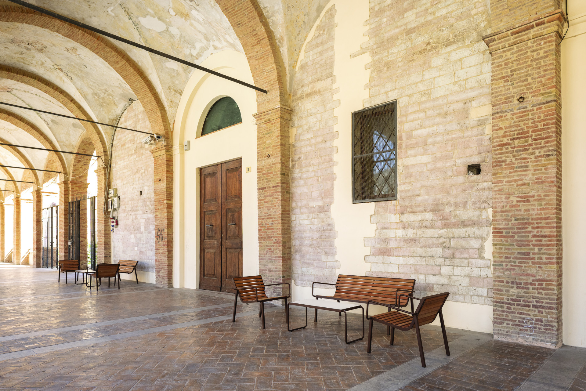 Elegantní průchod, který byl původně postaven jako spojení kostela San Francesco s náměstím Piazza del Comune, se skládá z 19 klenutých oblouků rámujících impozantní výhled na náměstí s palácem Pallazzo del Podesta a fontánou. Tuto renesanční architekturu dokonale dokreslují soupravy židlí a stolů z kolekce Stack. Znáte je z řady našich dalších projektů využívajících jejich nezaměnitelné pastelové barvy. V tomto případě jsme zvolili kombinaci dřevěných lamel a tmavě hnědé pozinkované ocelové konstrukce.