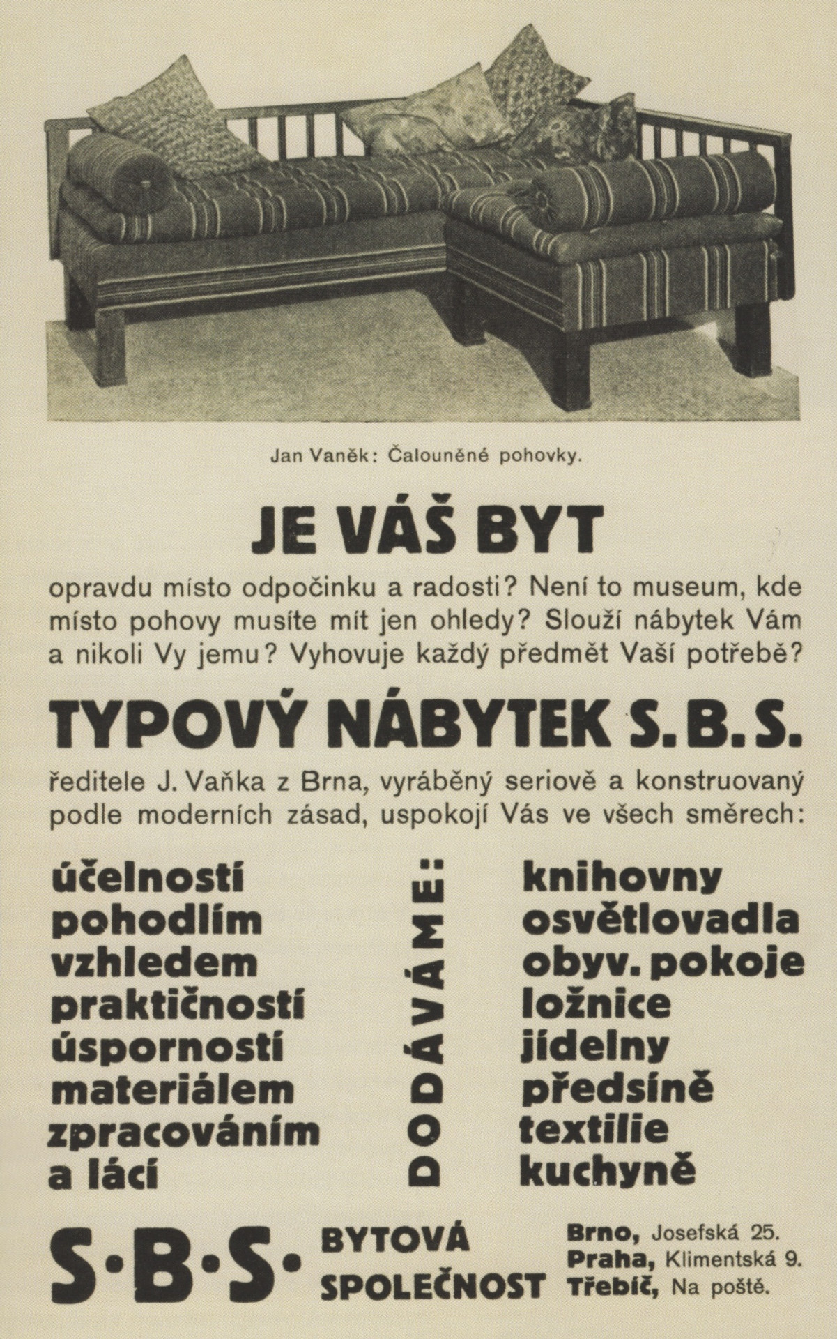 Po přesunu firmy Jan Vaněk dál navazoval spolupráce s výraznými architekty a pokračoval v budování podniku, který umožní všem vrstvám v zemi moderní a přitom dostupné bydlení. Za zásadní kvality bytového zařízení považoval užitečnost, funkčnost a hygienickou bezpečnost. Sériový nábytek podle jeho představ měl být z kvalitních materiálů s vysokou variabilitou, aby se dal přizpůsobit povaze bytu nebo domu.
