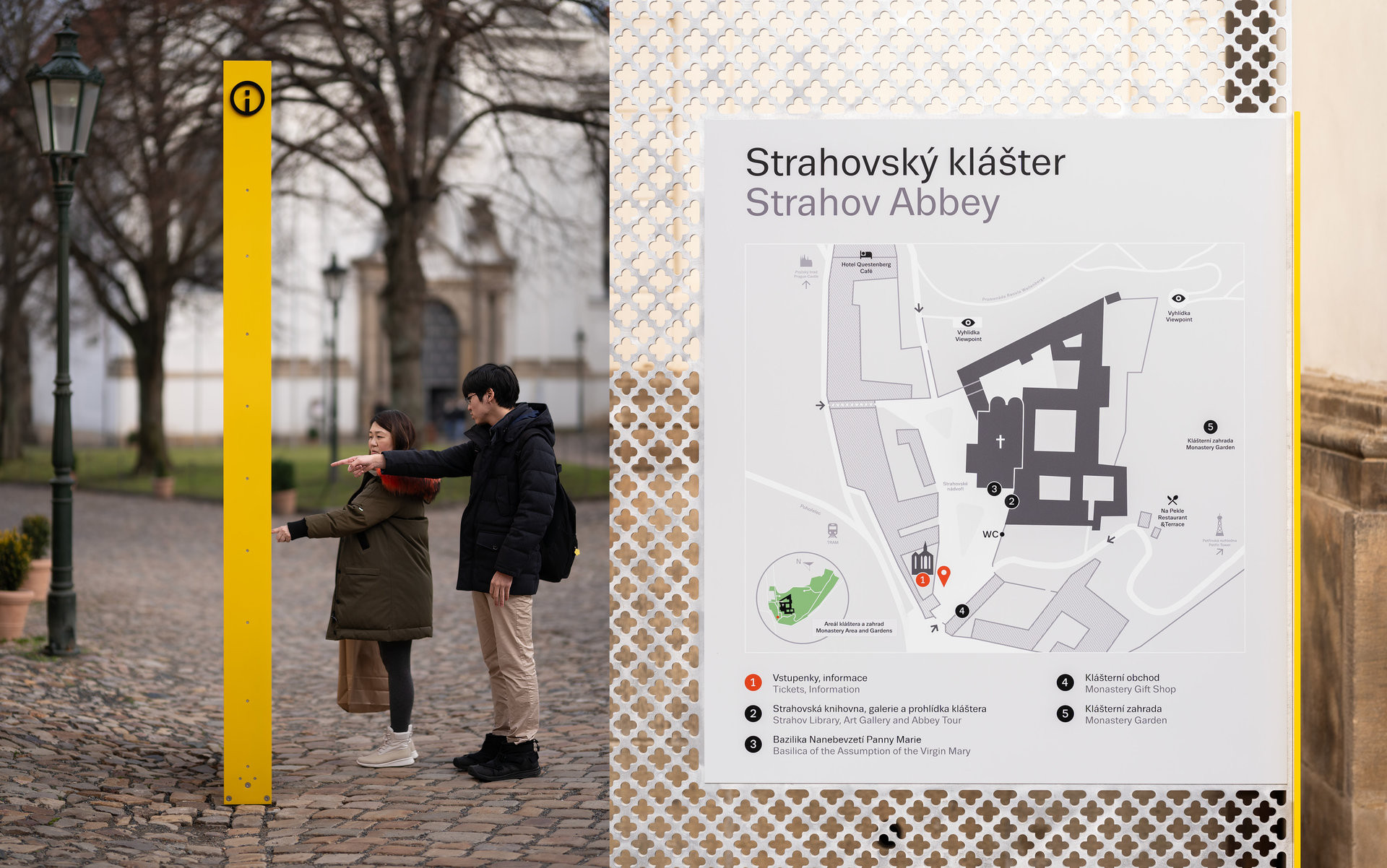 Na Strahově se teď návštěvník orientuje podle několika typů navigačních prvků. „Nebylo vůbec jednoduché najít vhodnou formu, vše navíc probíhalo pod dohledem památkářů. Naštěstí pan opat je schopný manažer, a přitom má pro každého ještě vlídné slovo,“ říká grafická designérka.