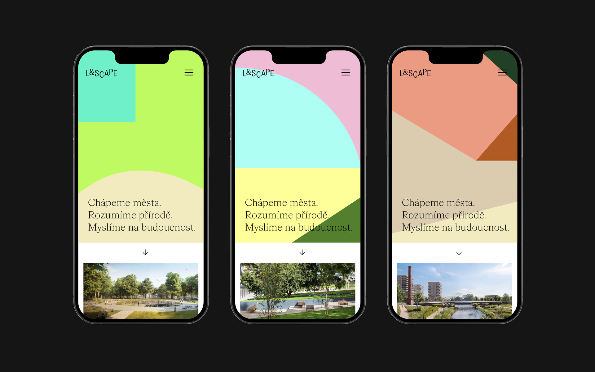 Jak by ale měl vypadat vizuální styl, který vystihne práci krajinářské architektky bez obvyklých vizuálních klišé jako jsou všudypřítomné trávy a stromy? „Volili jsme minimální prostředky. Linie simuluje horizont. Dále jsme použili barevné plochy, díky nimž vznikly jakési abstraktní krajiny,“ vysvětluje Matyáš Bartoň, jeden z autorů identity (spolu s Klárou Kvízovou a Jakubem Šilhavým.) Logo sestavili z českého písma Topol, které je „křehké i pevné,“ jak říkají.