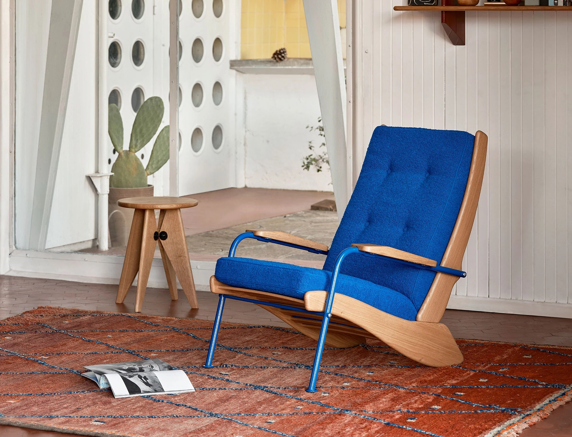 Jean Prouvé toto křeslo pojmenoval Kangourou, tedy klokan, což ukazuje na jeho vytříbený smysl pro humor. Křeslo, stejně jako jeho jmenovec, nese váhu na zadních nohou, což výrazně zvyšuje jeho pohodlnost. Estetický design postranních dřevěných profilů odráží jejich statickou konstrukci: jsou nejširší v místech, kde je vyvíjen největší tlak. Nová verze kombinuje přírodní dub s kovovým podnožím a sedákem čalouněným jemně tkanou látkou typu bouclé. Prouvé vytvořil pro svůj nábytek i architektonické projekty vlastní paletu barev včetně speciálních odstínů pro výjimečné zákazníky. Limitovaná edice křesla je vyvedena v expresivní modré Prouvé Bleu Marcoule, která vznikla v 50. letech 20. století.