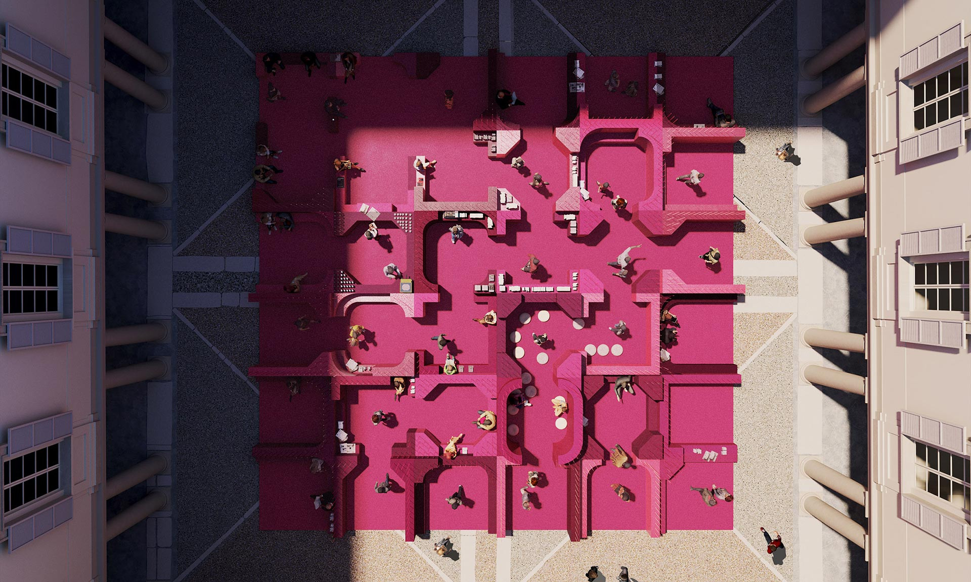 Po chvílích uklidnění, vám v nedalekém Palazzo Brera designérka Sara Ricciardi zase dopřála dávku serotoninu. Právě tak se jmenovala její instalace pro American Visa. Ambiciózní cíl, učinit nás šťastnými, chtěla zřejmě skrze duhové barvy a organické tvary. Podobně jako u nejfotografovanější letošní intervence – růžového bludiště pro MoscaPartners v Palazzo Litta od původně libanonské architektky Liny Ghotmeh, se ale nedalo ubránit dojmu, že i zde čím dál víc vítězí snaha vymyslet realizace, která bude fungovat na Instagramu. I duhové balóny tísnící se na balkóně paláce v mondénní čtvrti Brera, i už notně pošlapaná efektně barevná instalace, na kterou jste si aspoň mohli sednout, nepřinesly nic víc, než pěkný obsah do vašeho feedu.