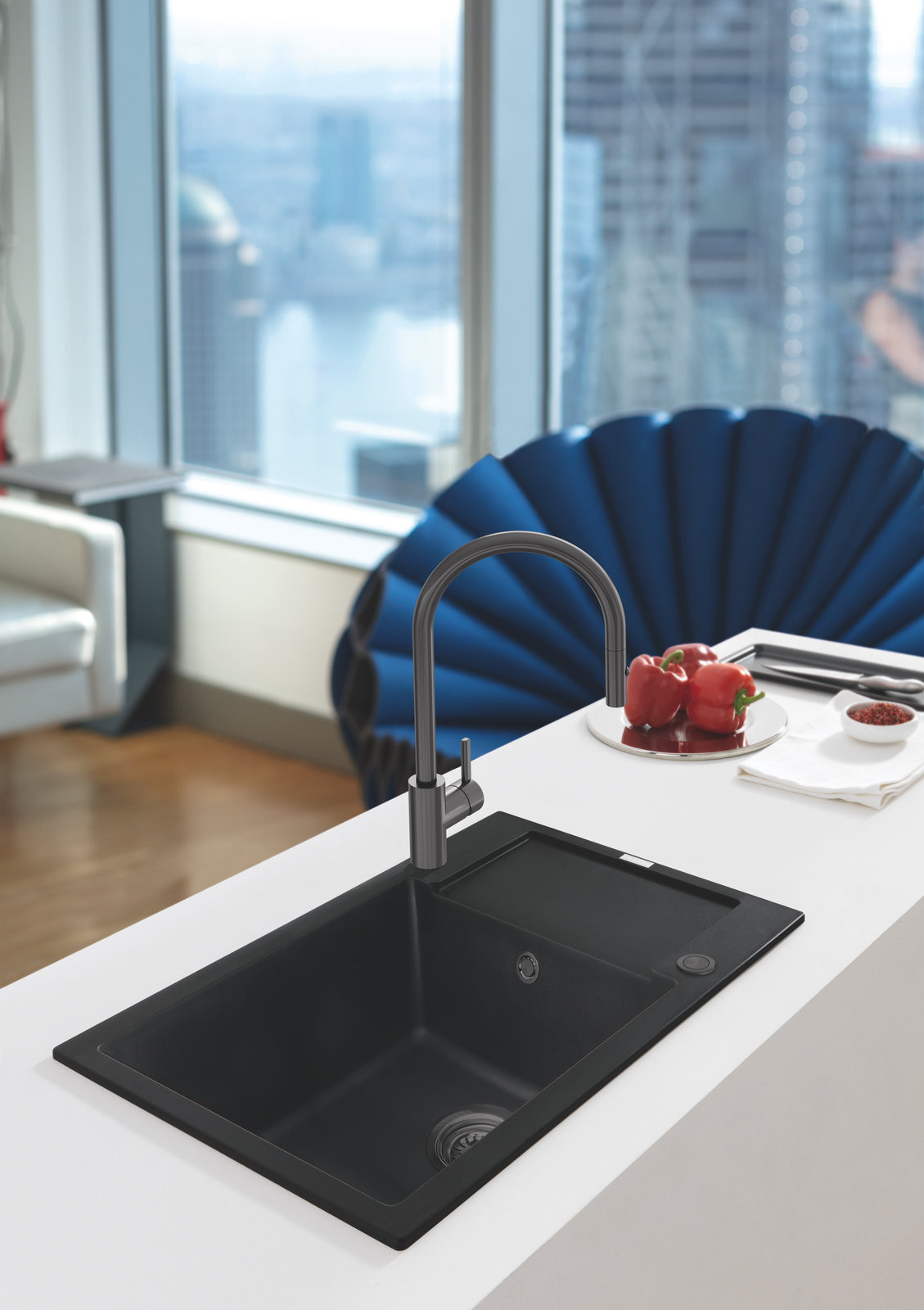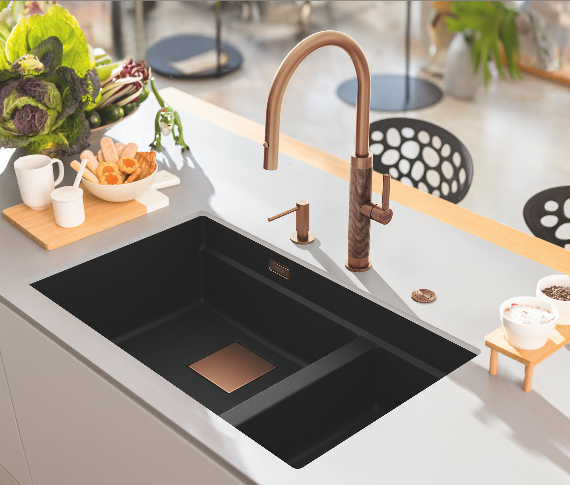 Dřezy si lze prakticky i esteticky vyšperkovat také příslušenstvím a doplňky. Například přípravnou deskou, odkapávací miskou či rolovací silikonovou podložkou. Díky příslušenství jako jsou výpusti, krytky přepadu nebo ovládací knoflíky, zase docílíte efektních barevných kombinací. Dostupné jsou v černé, antracitové, ale dokonce i měděné nebo zlaté.