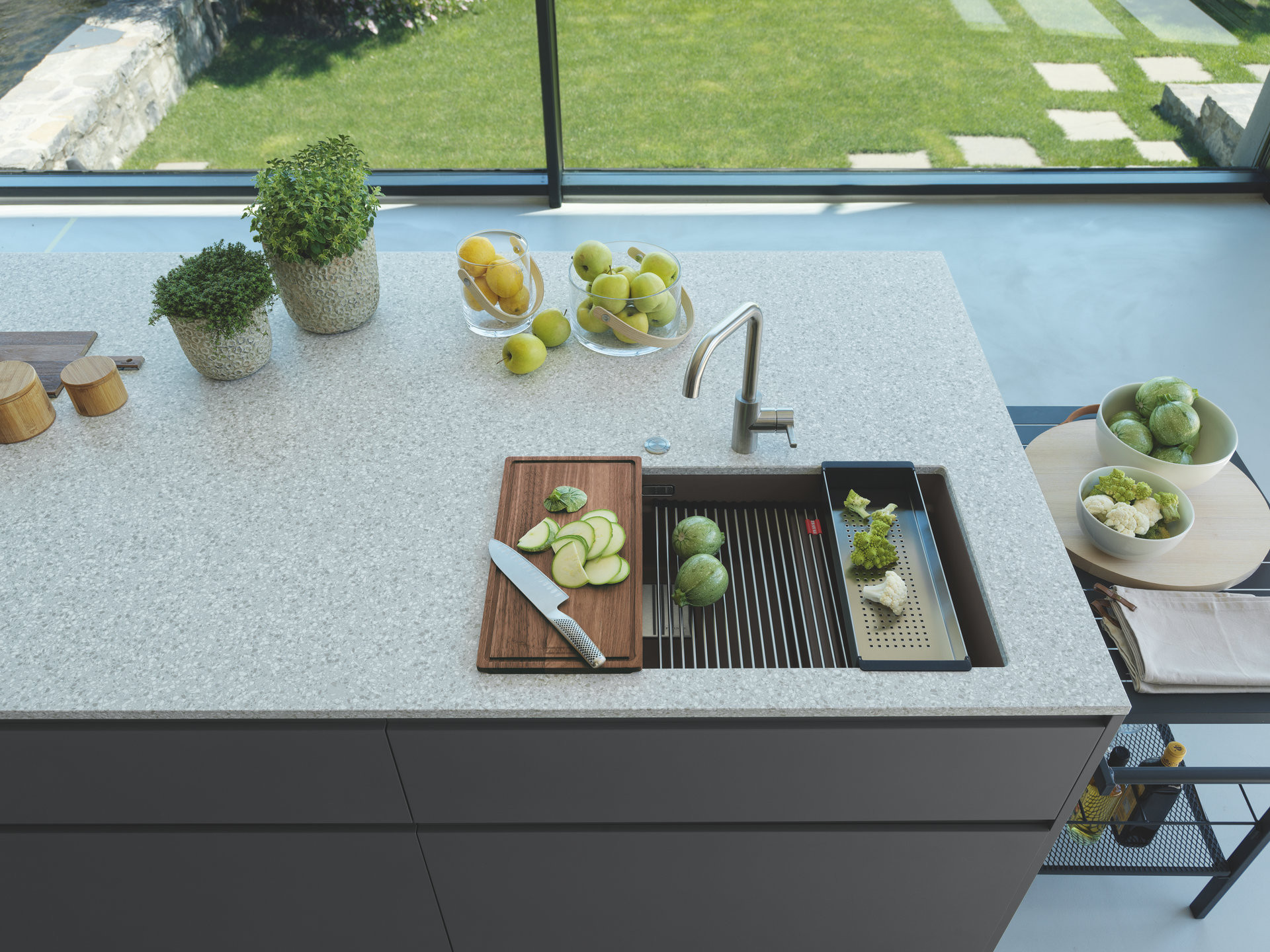 Akrylátové pojivo umožňuje tvarovat tenké hrany a čisté detaily – dřezy z Fragranitu tak často pracují s minimální výškou lemu, integrovaným přepadem nebo krytkou výpusti.
