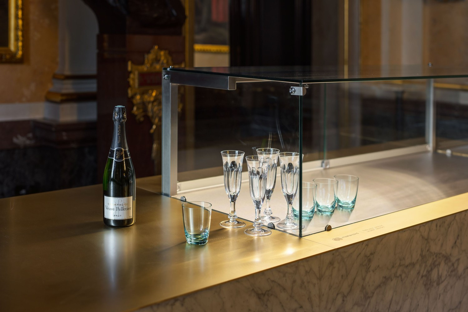 Do prostorů historické architektury Národního divadla v Praze navrhli architekti Miroslav a Jana Stachovi ze studia boq architekti nové barové pulty. S honosně pojatými interiéry komunikuje barový mobiliář především použitými materiály, jako jsou mosaz, mramor a sklo, které dohromady tvoří elegantní a funkční prvek interiéru.