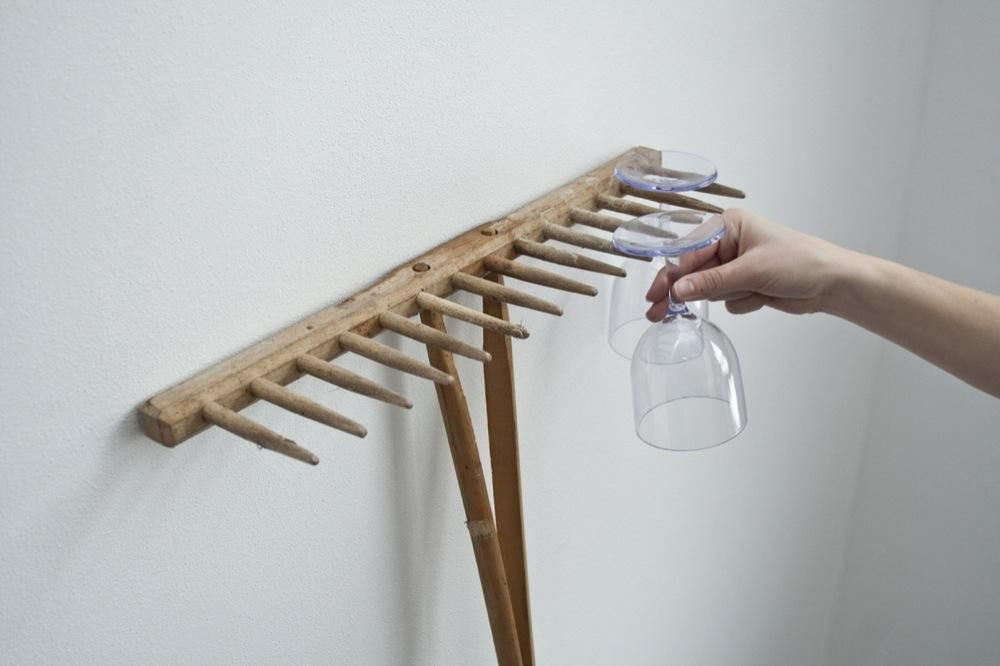 Mohlo by se zdát, že sedlák, právě hotov se svojí prací, opřel hrábě o zeď, a to tak nerozumně zuby nahoru a ještě k tomu ven, a poté zjistíme s radostí, že toto náčiní neslouží k práci nýbrž k požitku. Možná také v tomto pořadí, což dělá z tohoto dřevěného náčiní malou provokaci, která naskýtá otázku, co je vlastně důležitější. Hrábě, nebo víno? Práce, nebo požitek? Náhoda je dobrým designérem, musí se jí jen nechat. Gratuluji, že si tohle někdo uvědomil.